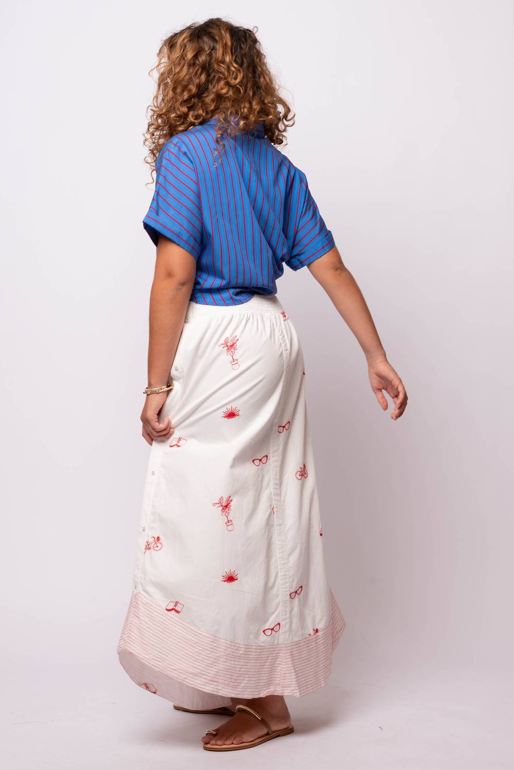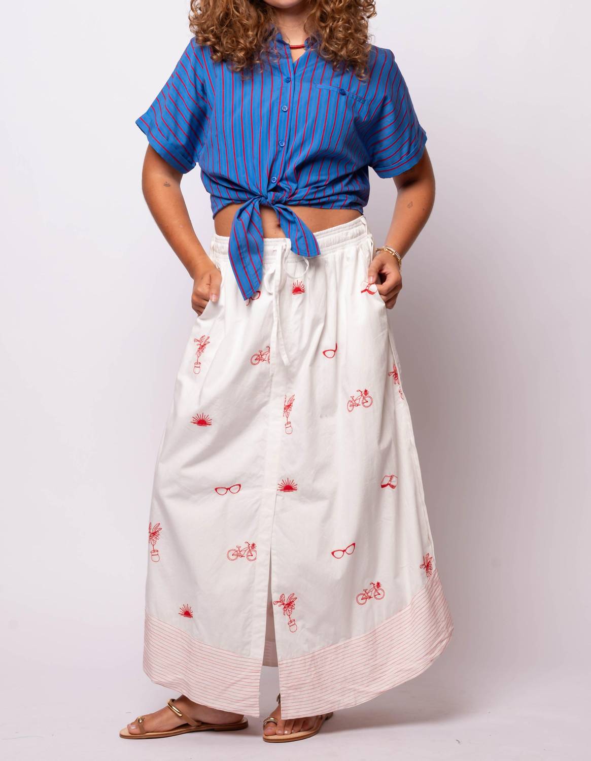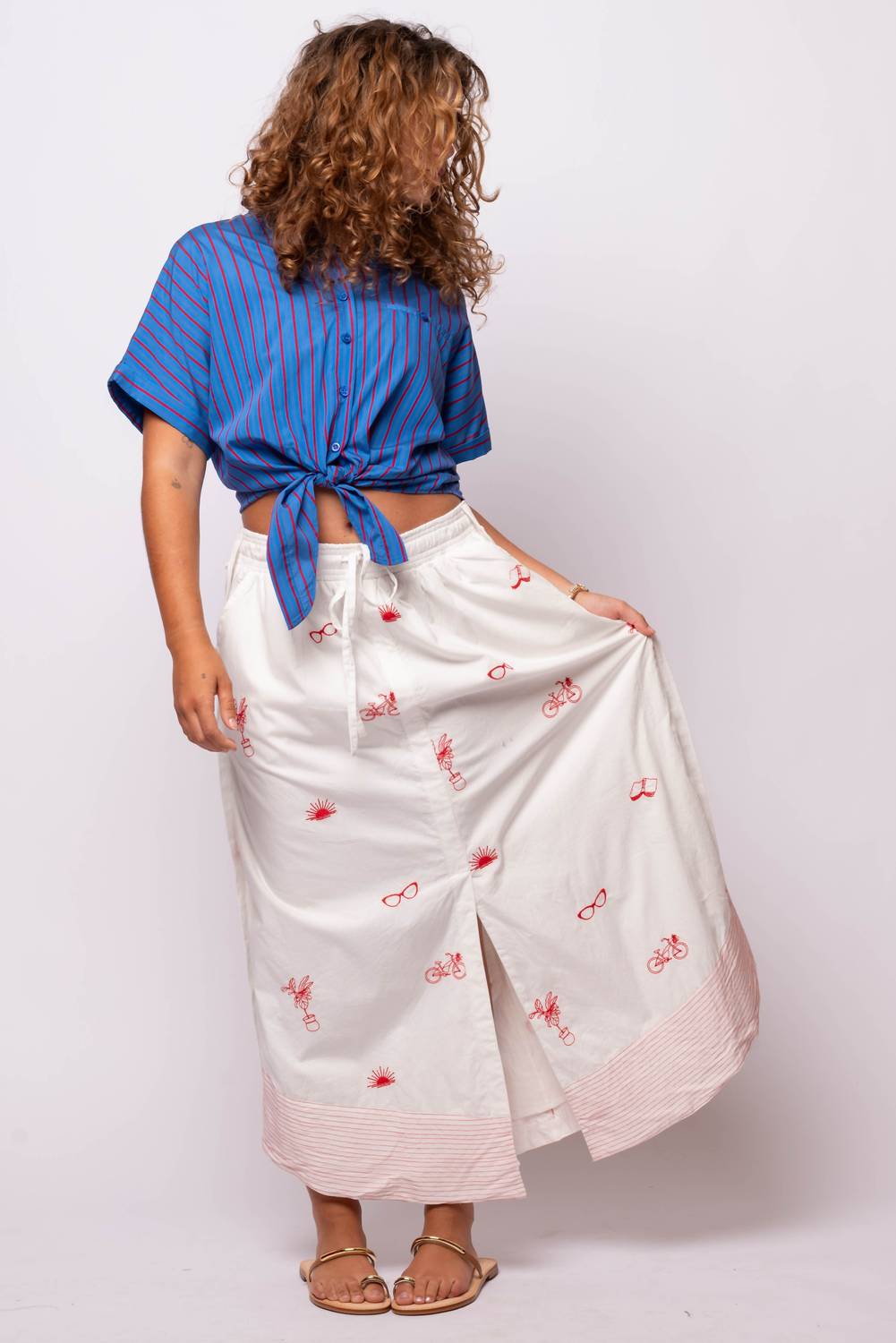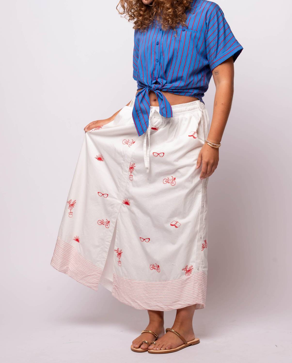 Tuck in your favorite tee for a more casual yet feminine look. Elevate your summer wardrobe with the Women's Picnic Perfect Skirt by CIEBON, a breezy cream maxi featuring a playful red graphic print. This skirt is crafted from lightweight 100% cotton, imported with care, and showcases a high-low hem and practical tie closure for an adjustable fit. Its relaxed style is complemented by pockets, making it as functional as it is stylish for beach outings or casual lunches. Easy to maintain, simply hand wash this skirt to keep it looking fresh and ready for your next sunny adventure. Model is 5'5" with measurements 33" bust, 26" waist, and 35" hips, wearing size X-Small.