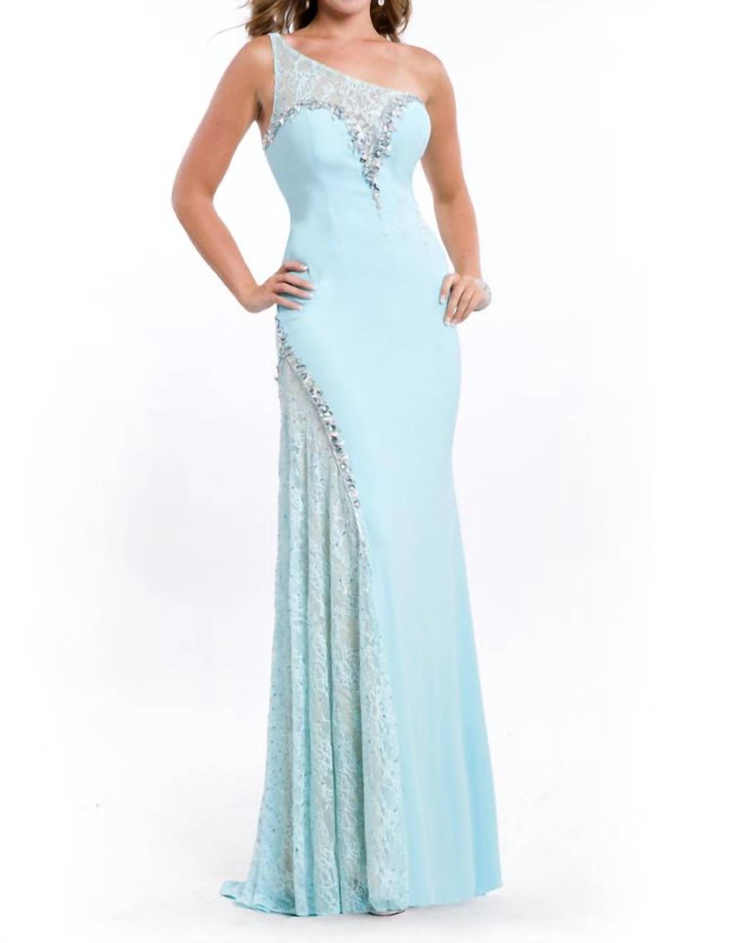 Looking for that perfect event dress? Look no further... Introducing the One Shoulder Jersey Gown 6562 by Rachel Allan, a stunning piece in an aqua shade perfect for prom. This sleeveless gown features exquisite lace insets and a jewel trim that adds an elegant touch to its sheath silhouette. Made from jersey fabric, it ensures comfort while maintaining style. Ideal for making a memorable entrance, complete your look with this elegant gown.