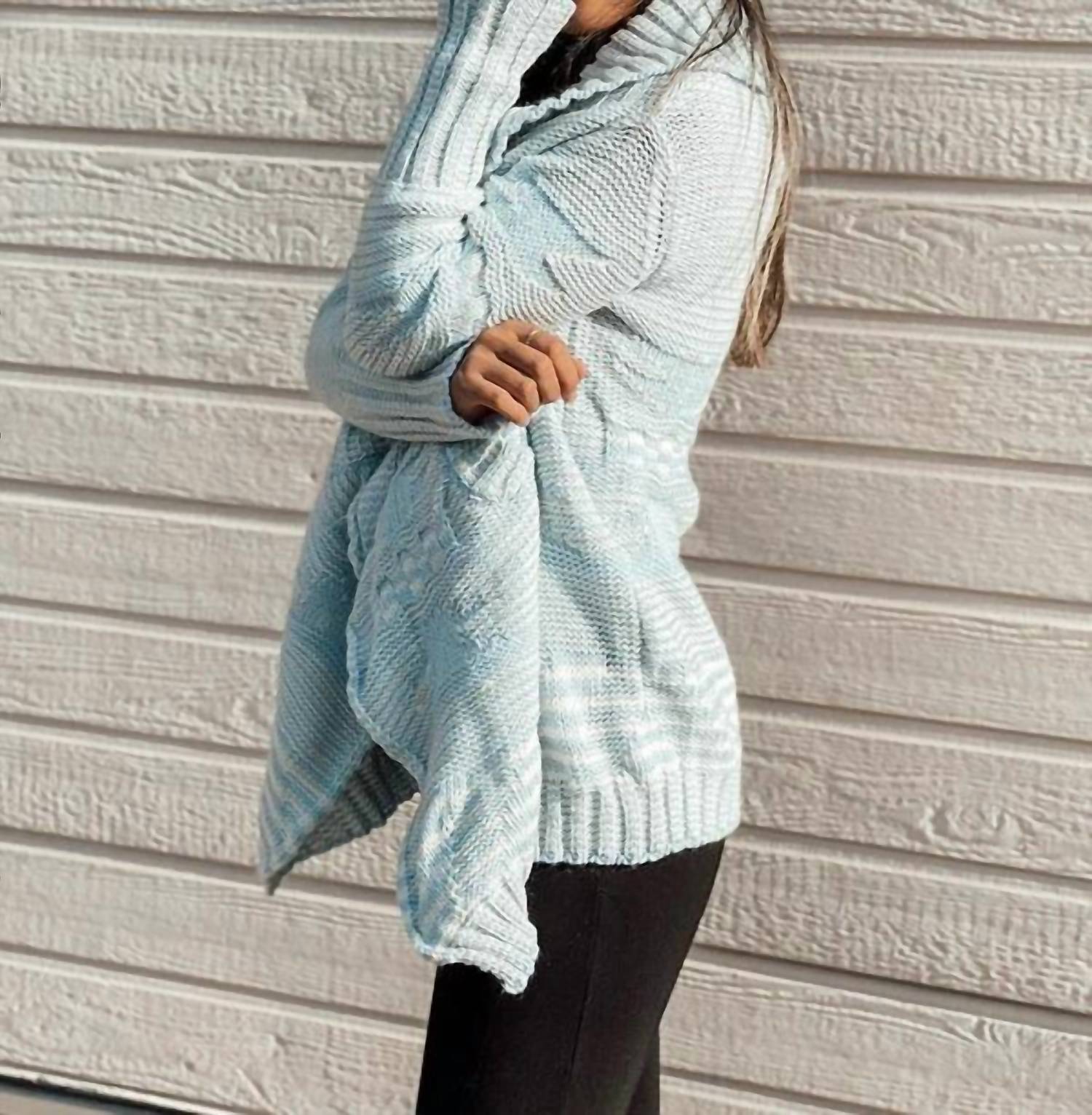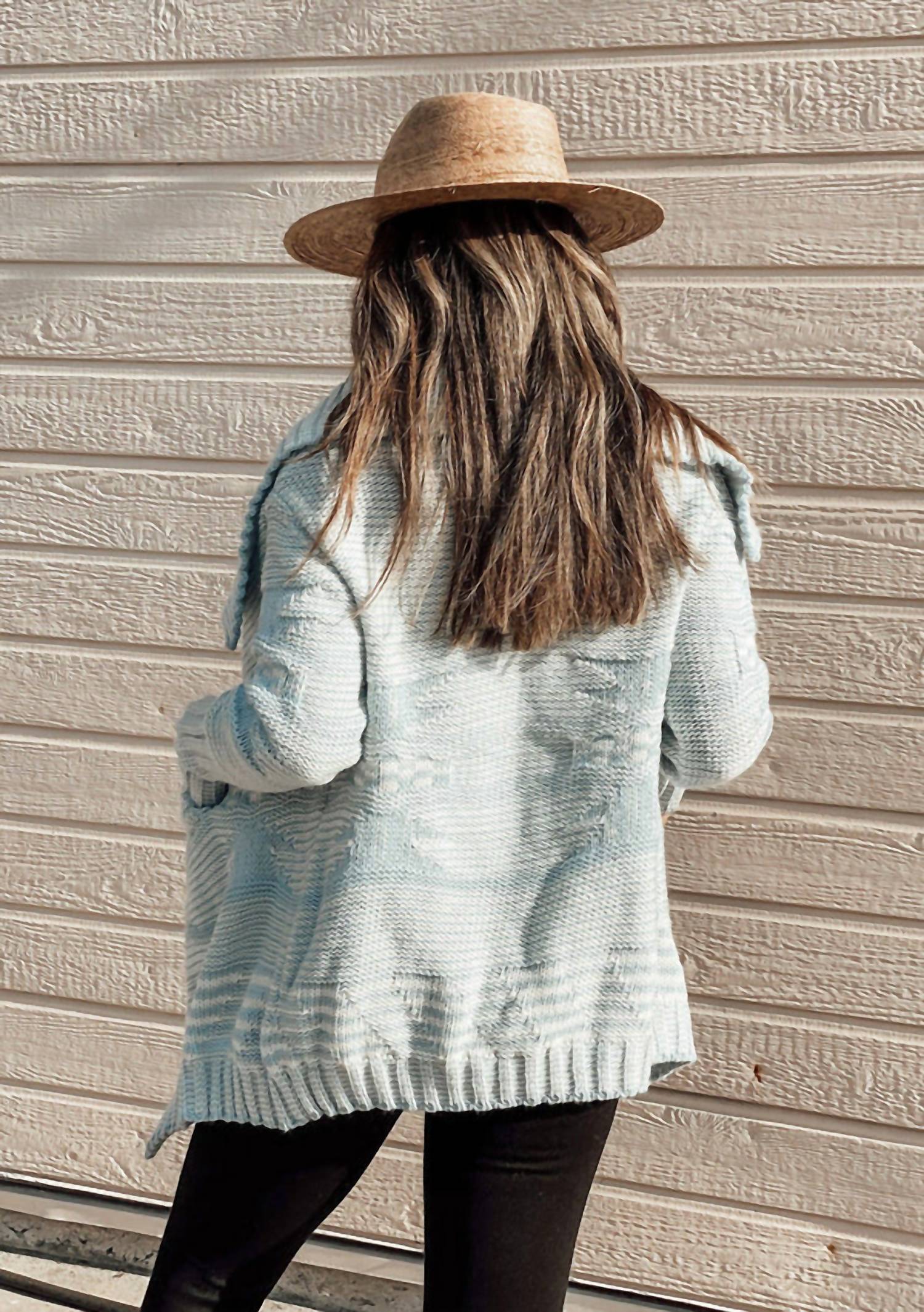 Throw this adorable cardigan over any cami or tank top. Embrace warmth and style with the Feeling Cozy Long Sleeve Cardigan by LOVESTITCH, designed in a captivating sky blue. This cardigan features an oversized shawl collar and essential side pockets, while contrast ribbed details enhance its southwestern style pattern. Crafted from a blend of 70% Acrylic and 30% Wool, it offers both comfort and durability. Closure: Pull on. Care: Machine wash and tumble dry for easy maintenance.