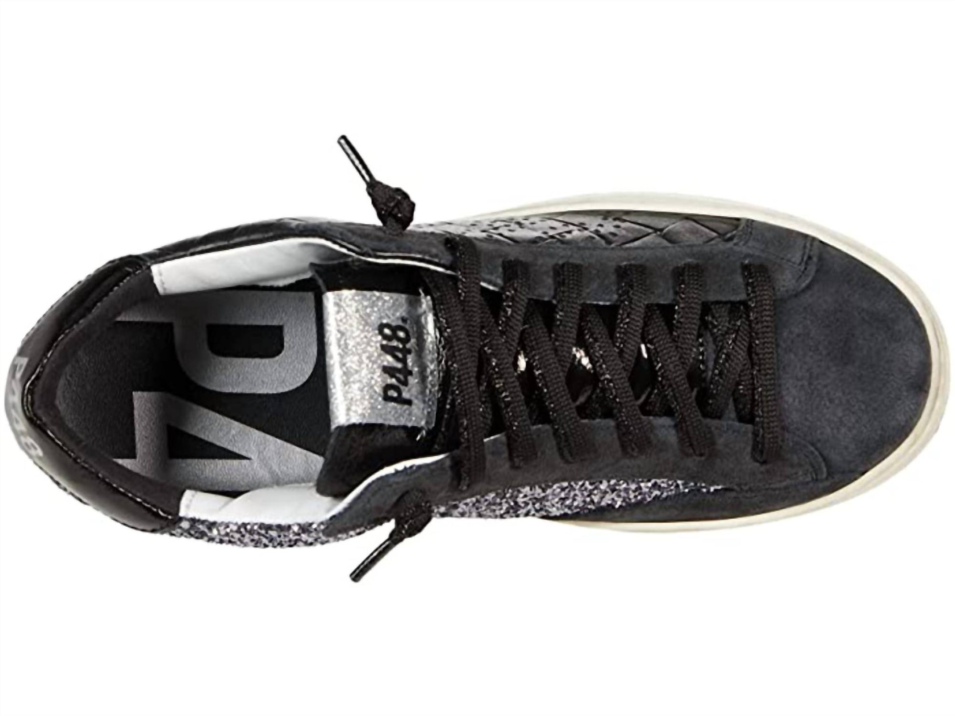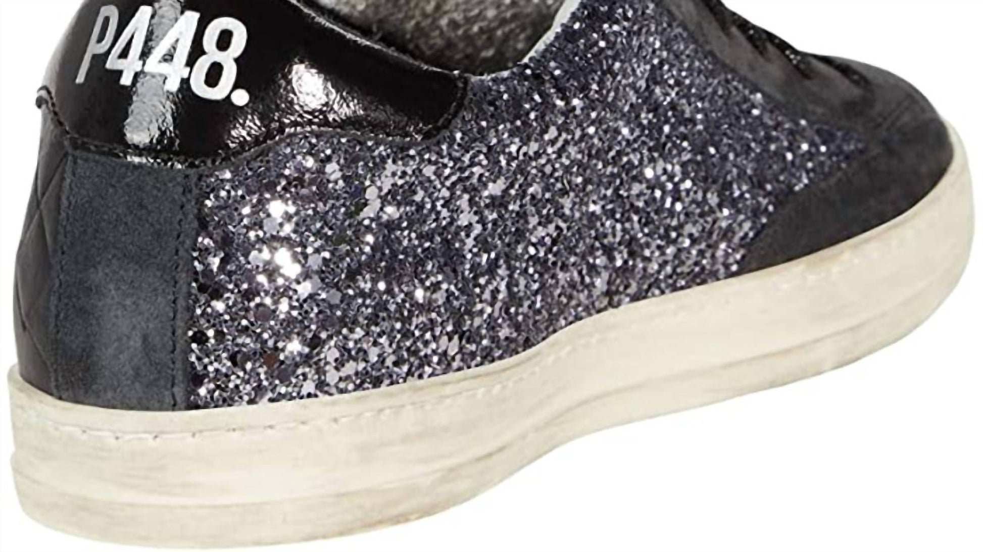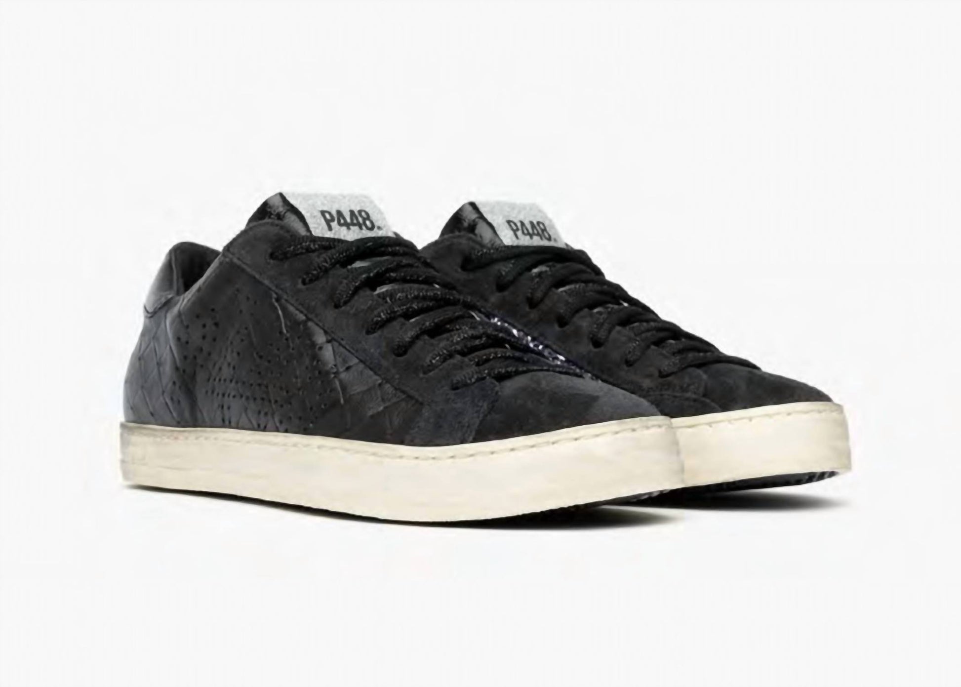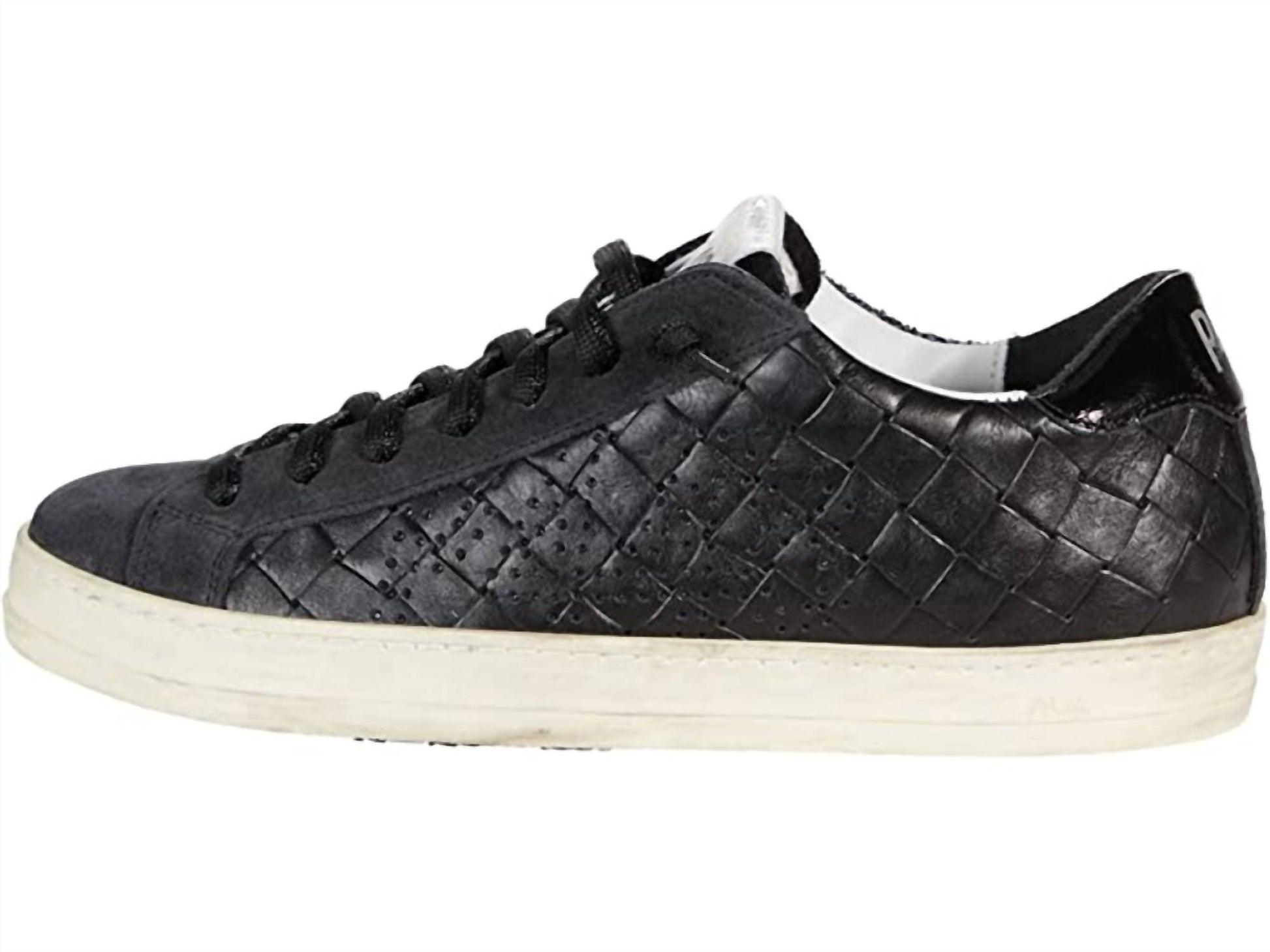 Get your daily steps in with these adorable sneakers. Discover the Women's John Mousse Sneakers by P448, expertly crafted in Italy from premium, durable leather for everyday wear. This updated style features a sleek black woven textured side, a shimmering glitter panel, black tongue, toe, and heel tab, along with a black suede trim. Fastened with half sparkle laces, these sneakers boast a P448 customized rubber cupsole for ultimate comfort and style. Fits true to size, making these shoes a trusted favorite for any wardrobe.
