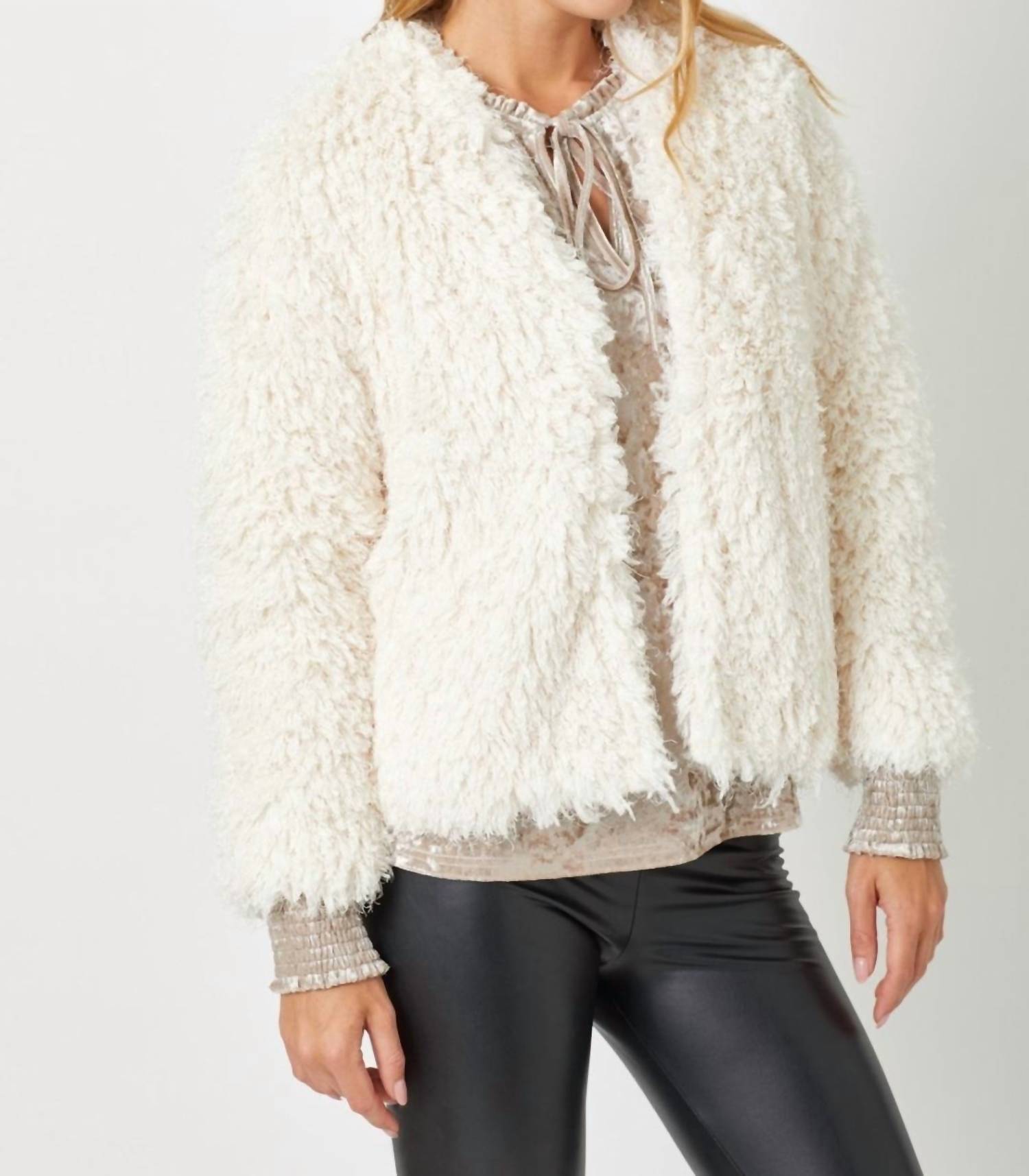 You'll be reaching for this puffer jacket all season long. Meet the Mystree Faux Fur Open Jacket, a chic addition to your outerwear collection in an elegant cream hue. This waist-length puffer features long sleeves and a V-neck, crafted with a boxy shape for a modern silhouette. Made from 100% polyester shell with a lining of 97% polyester and 3% spandex, this piece combines comfort and style. Care instructions specify hand wash and line dry. Imported.