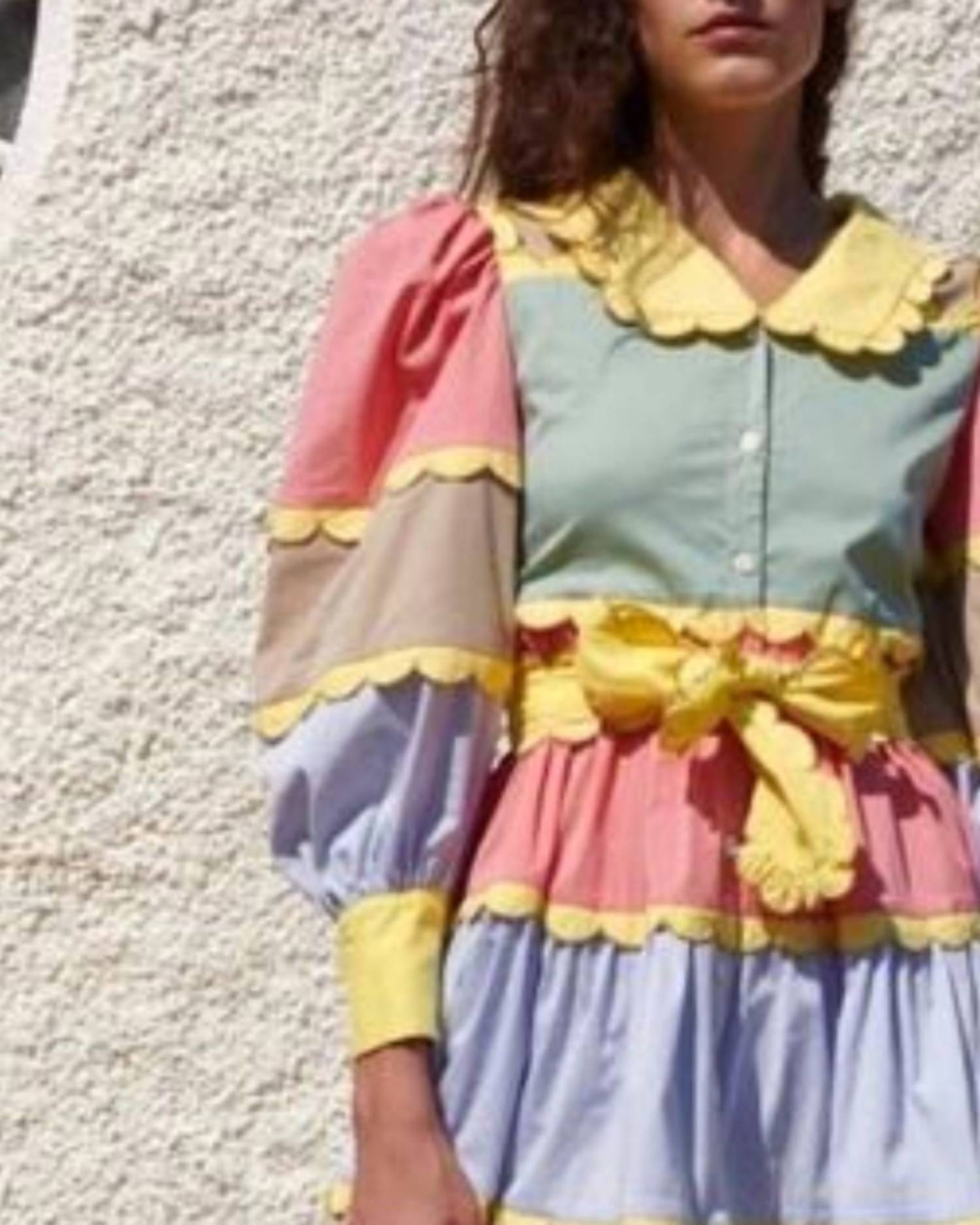 A short and breezy dress for those warmer days. Embrace a bold summer style with the Aries Mini Dress by CELiA B, showcasing a vibrant multi-colored pattern perfect for any vacation. Designed with three-quarter sleeves and a flattering belted waist, this patterned shift dress features elegant scallop details and a sophisticated collar neckline. Closure: Button closure. Ideal for the maximalist trend, this dress effortlessly blends playful color blocking with timeless design elements.