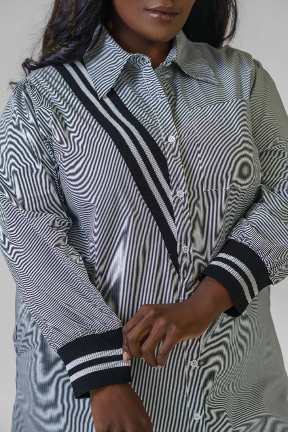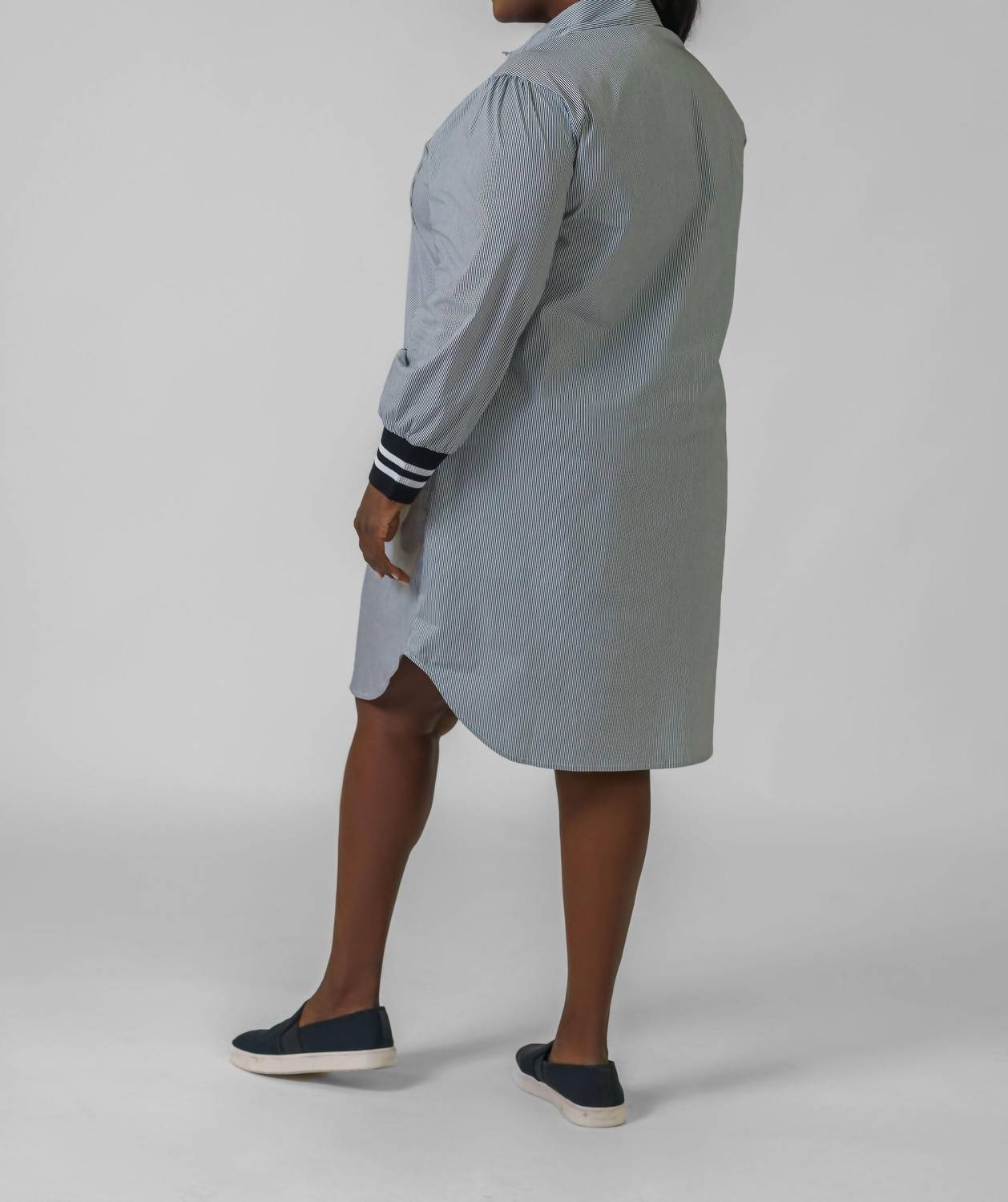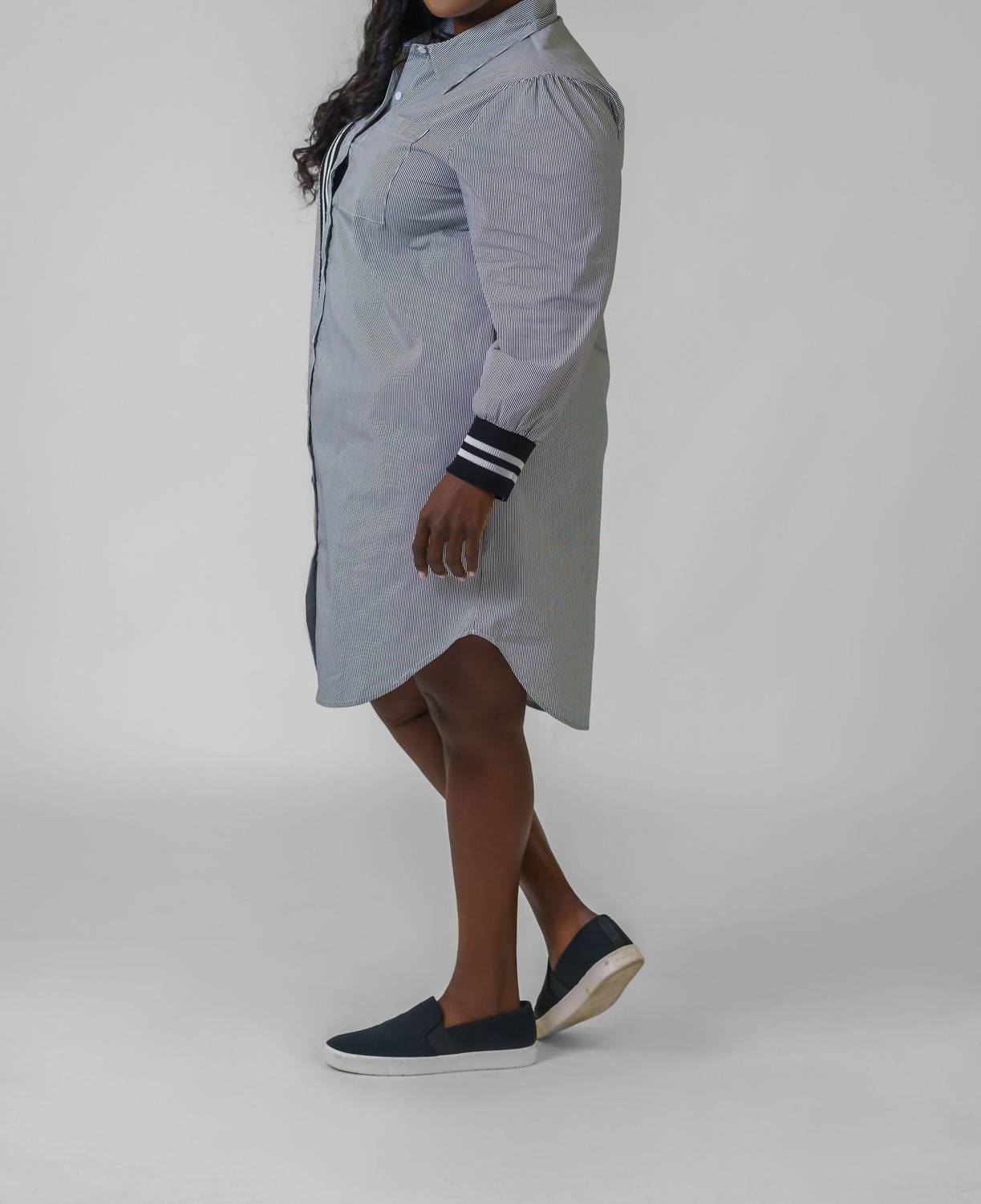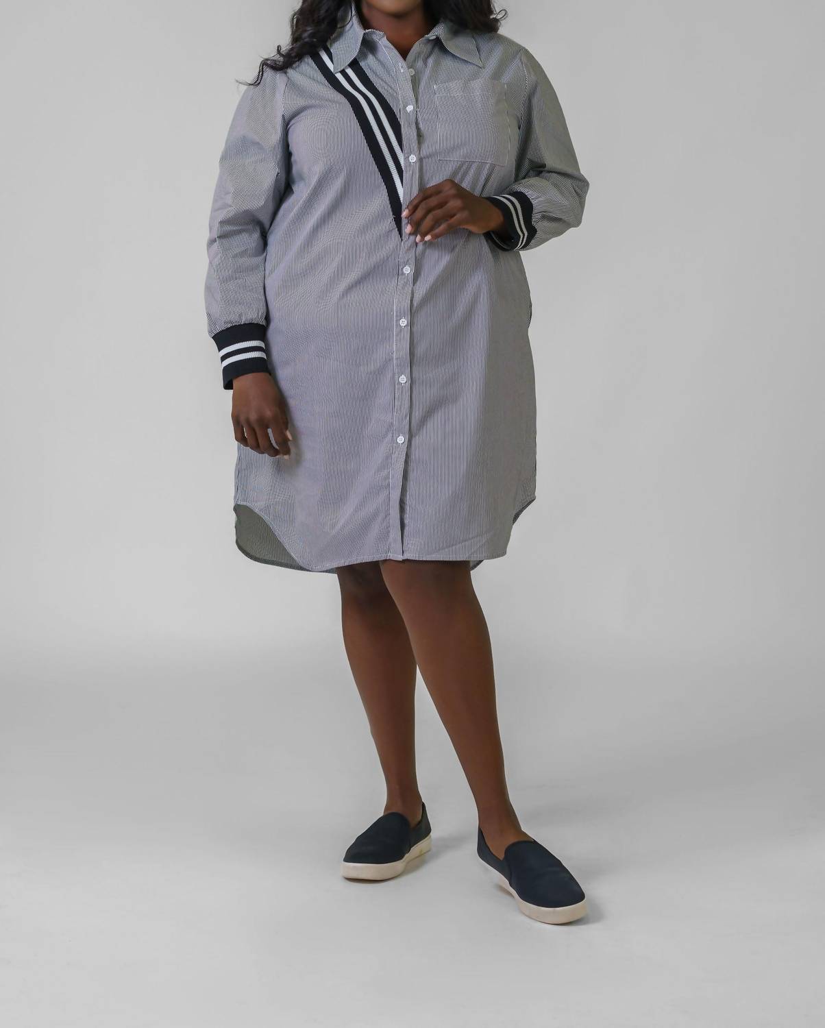 The kind of easy and flattering dress you'll be reaching for all season long. The Wenna Shirt Tunic Dress by JOH is a stylish and comfy addition to your wardrobe, perfect for a dinner party or workwear ensemble. This mini dress features long sleeves and is crafted from a comfortable blend of 65% cotton, 32% nylon, and 3% spandex, combined with a stretch striped ribbed contrast, and is patterned for added flair. Designed with a collar neckline and handy pockets, it offers a versatile option to wear as either a tunic or dress. Closure: Button closure. Care: Hand wash and line dry. This plus-size garment is a must-have for spring.