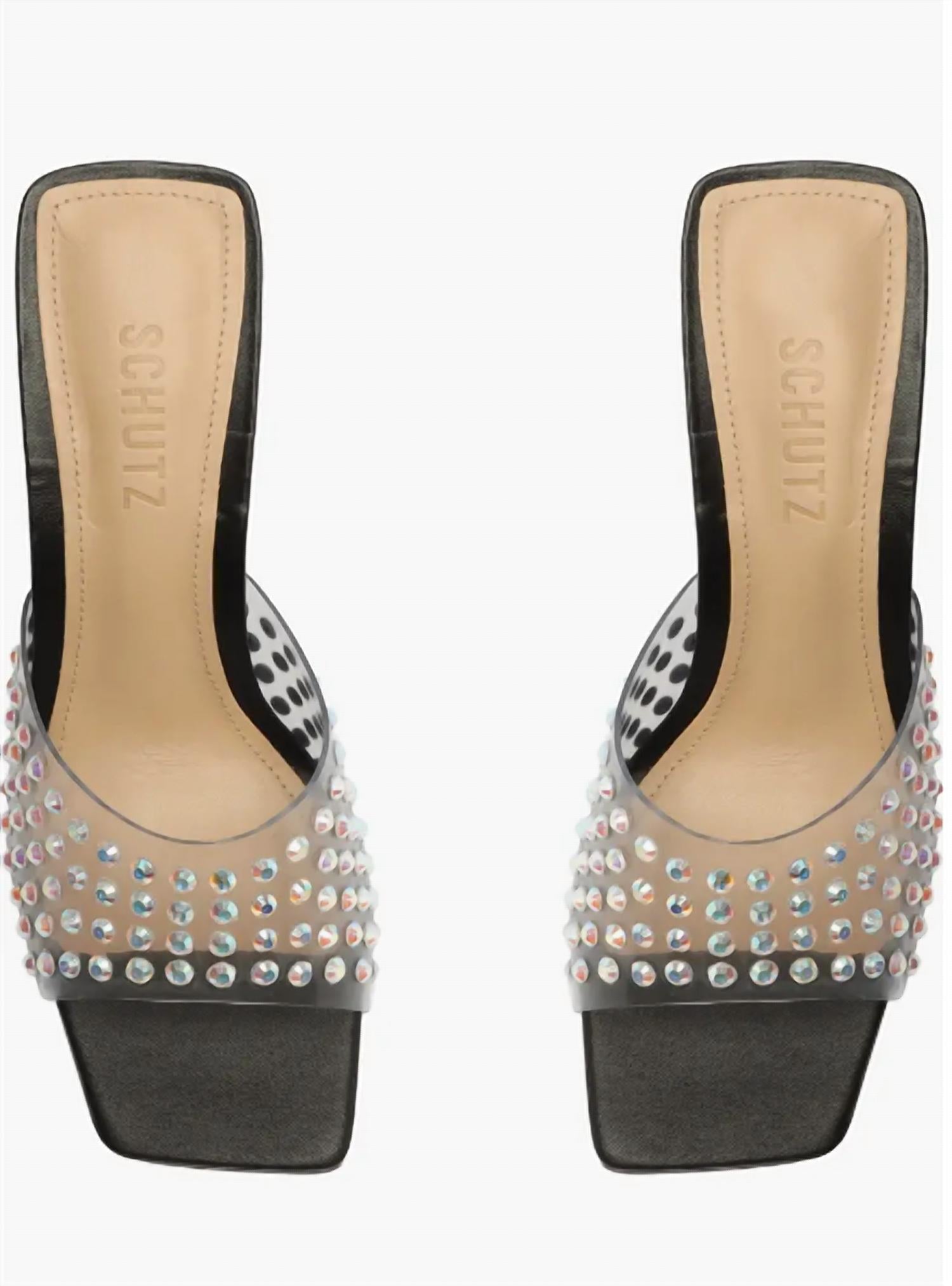 Don't be deceived, these heels are comfy as can be. Elevate your style with the Women's Lizah Block Heels by SCHUTZ, blending elegance and modern flair. This slip-on sandal features a crystal-clear synthetic upper with a rhinestone-embellished clear strap, perfect for making a statement. Crafted with a 4-inch wide, slender triangular heel and a chic square open toe, these shoes offer both style and comfort. Lined with leather, the sole is meticulously crafted in Brazil, ensuring quality and durability.