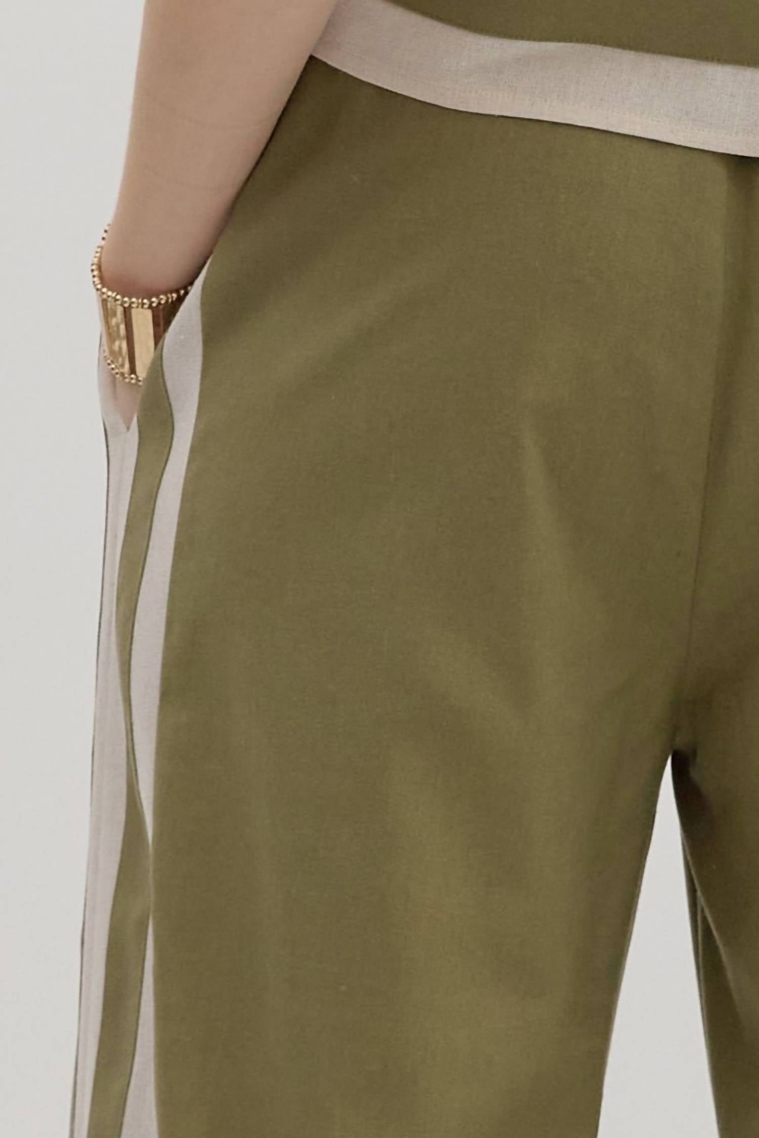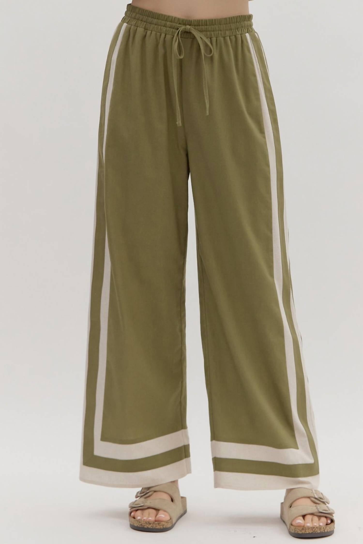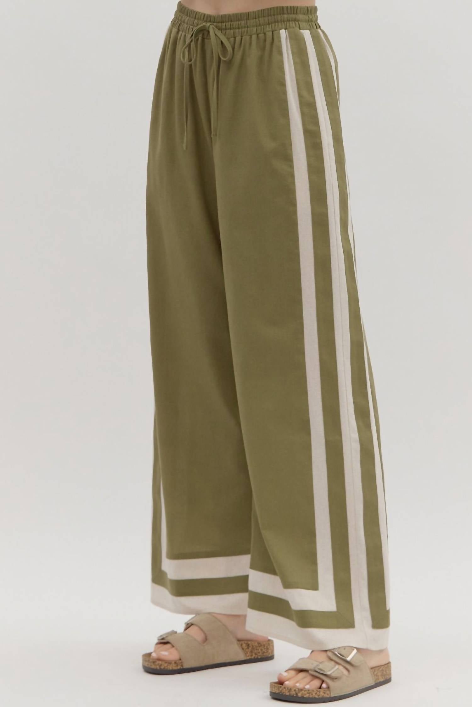 Introducing the Avenue Wide Leg Trousers by Entro, the ultimate choice for vacation-ready style in a solid olive green hue. Crafted from a linen blend with 40% Linen, 40% Viscose, 10% Cotton, and 10% Polyester, these high-rise trousers feature a wide-leg, relaxed fit perfect for summer chic. Equipped with an adjustable drawstring and elastic waistband, they ensure comfort with a practical tie closure. Care for these trousers is simple with machine wash and tumble dry instructions.