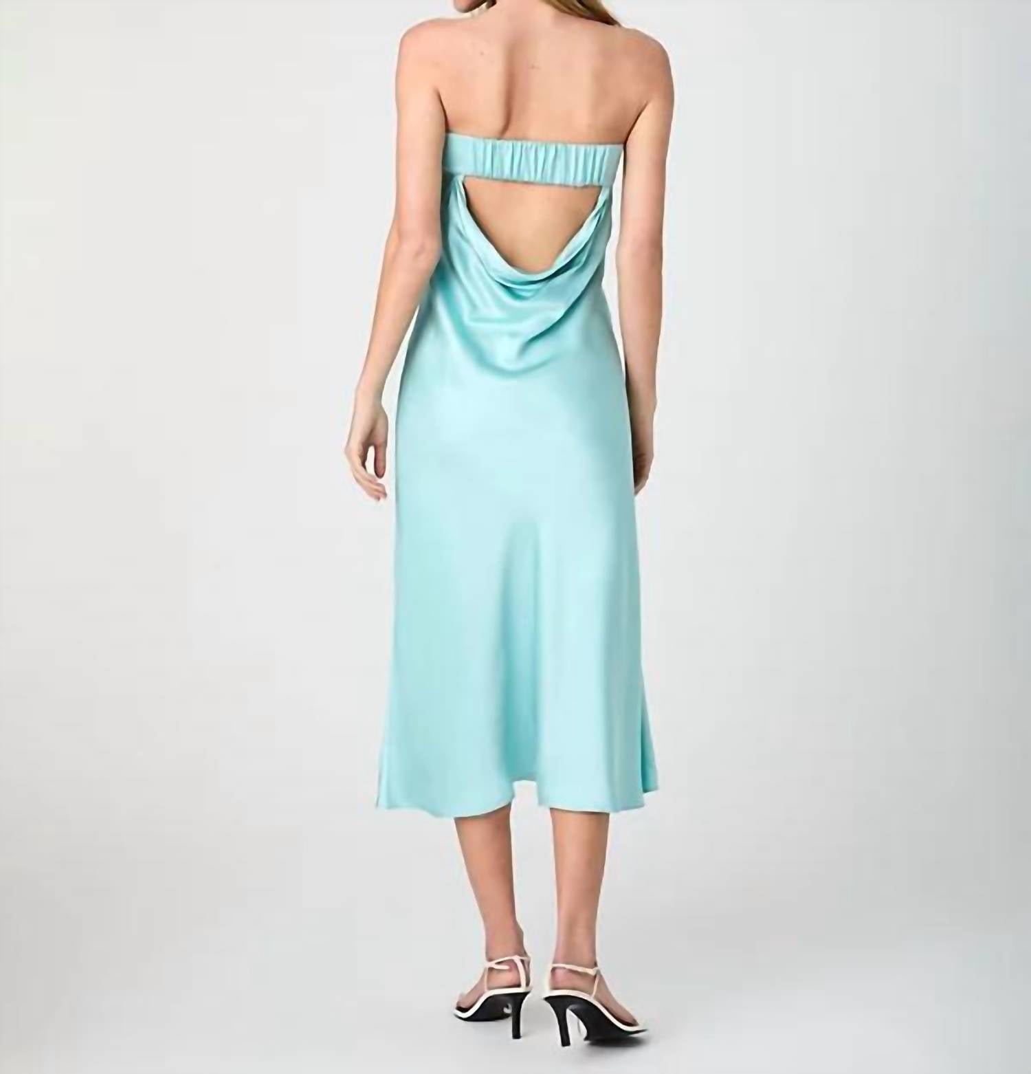 A midi dress so versatile, your options for wearing it are endless. Embrace elegant minimalism with the Oona Satin Strapless Midi Dress by French Connection, offered in a stunning pastel turquoise hue. This sophisticated A-line silhouette boasts a strapless design with a bias-cut neckline and a cowl back featuring elastic and a keyhole detail. Crafted from lustrous polyester satin, this dress is approximately 42 inches long from the center back neck to the hem and is fully lined for comfort. Closure is pull-on, ensuring easy wear, and care instructions recommend dry cleaning only.