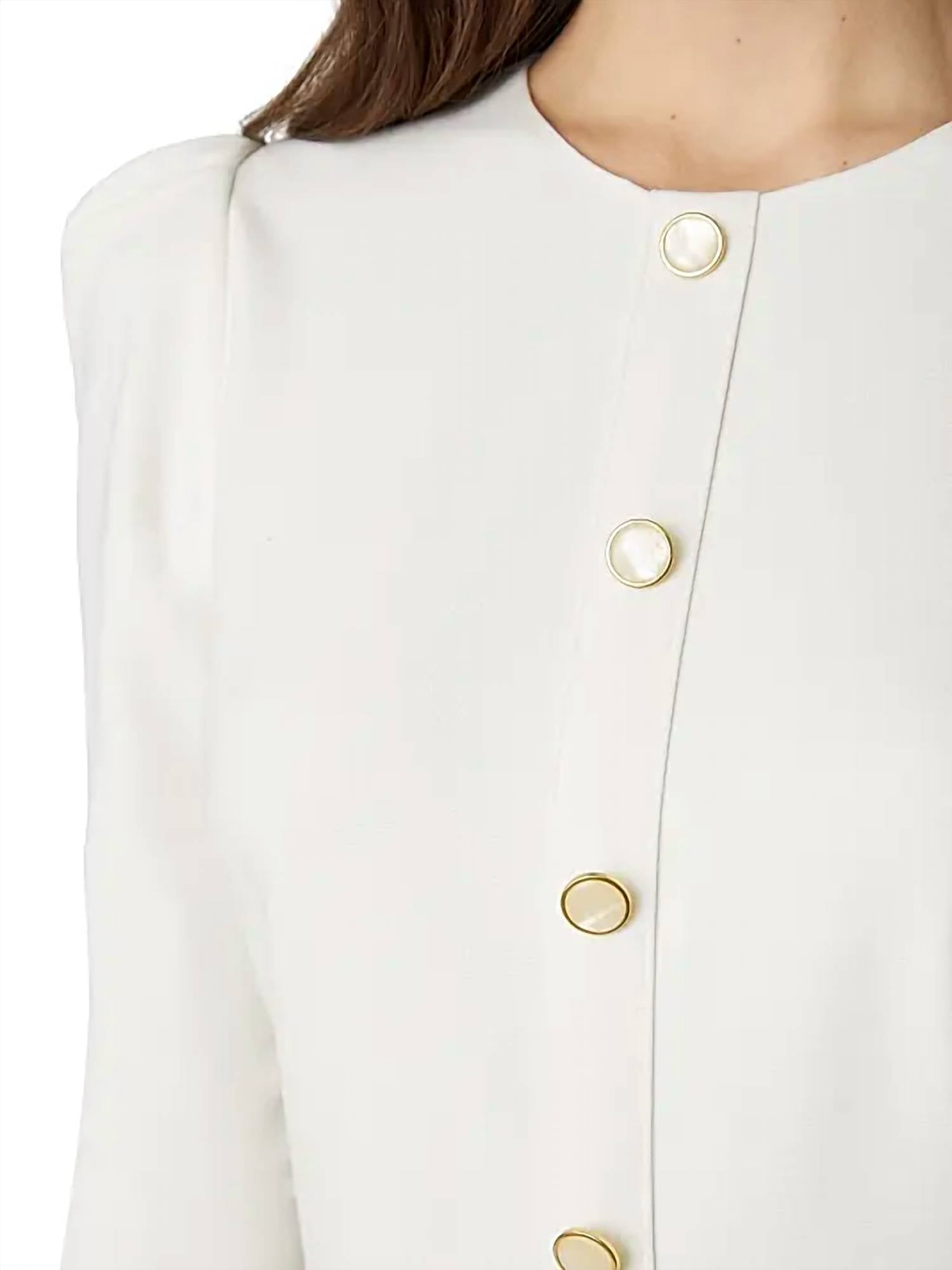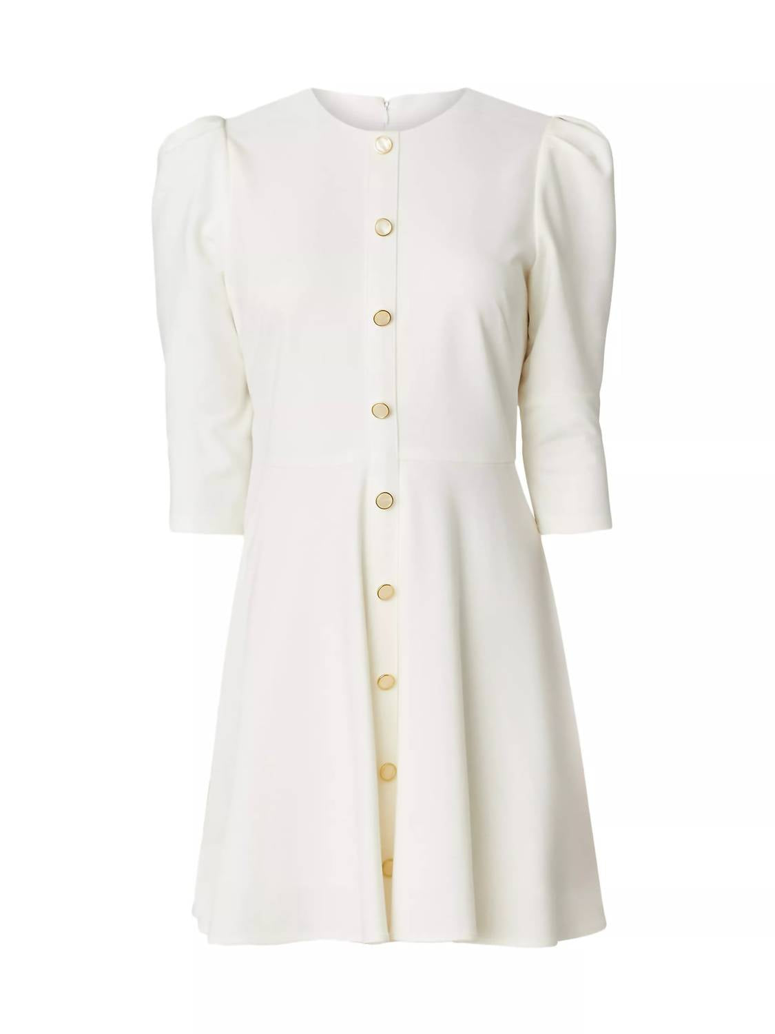 The perfect mini dress for those warmer months. Introducing the Audra Mini Dress by Shoshanna, a stunning piece in elegant ivory designed for your next dinner party. This dress showcases a fit-and-flare silhouette with three-quarter-length puff sleeves and pearlescent rimmed button accents. Crafted from a nylon blend comprising 67% rayon, 28% nylon, and 5% elastane, it features a convenient zip closure. Care instructions recommend dry cleaning to maintain its sophisticated allure.