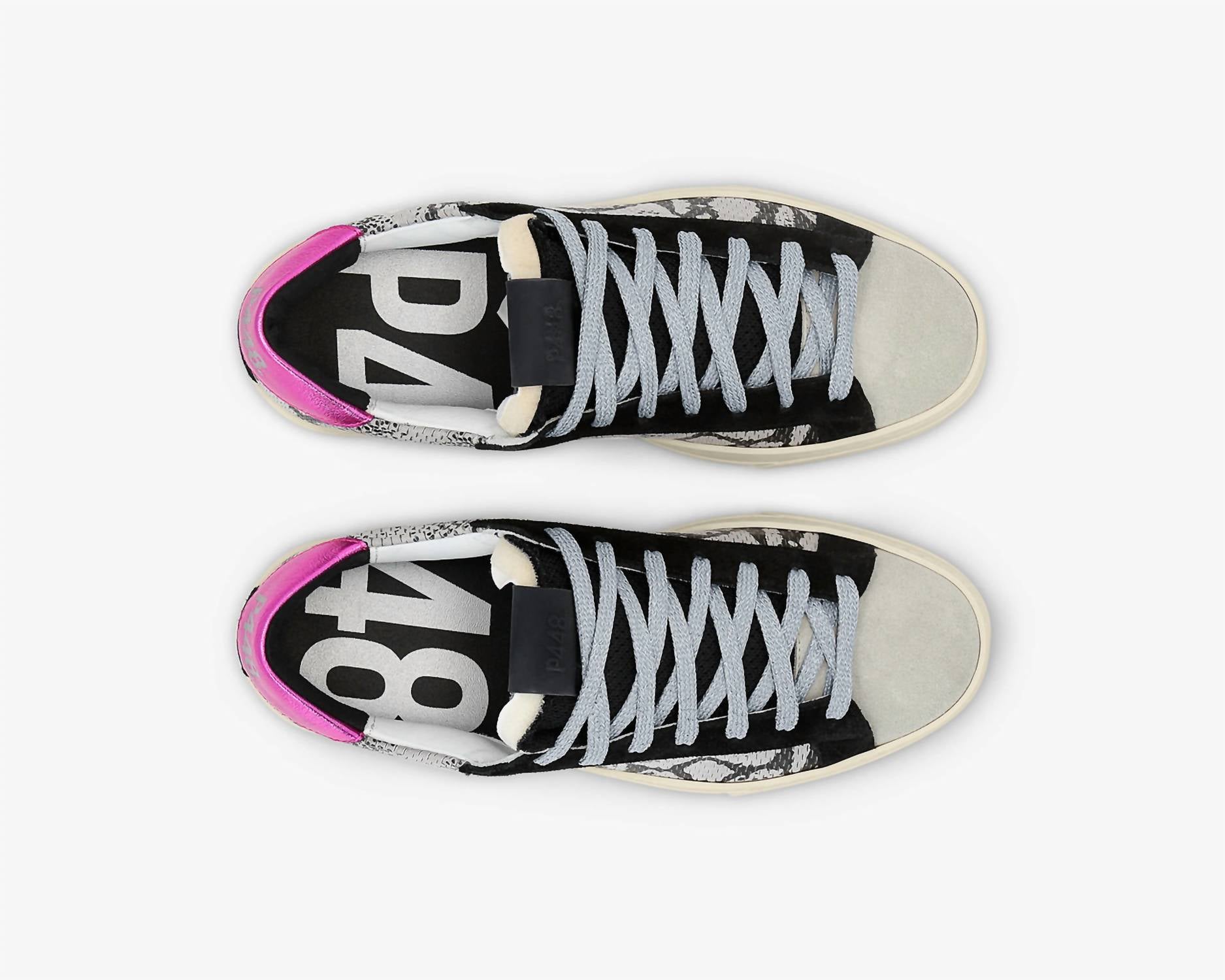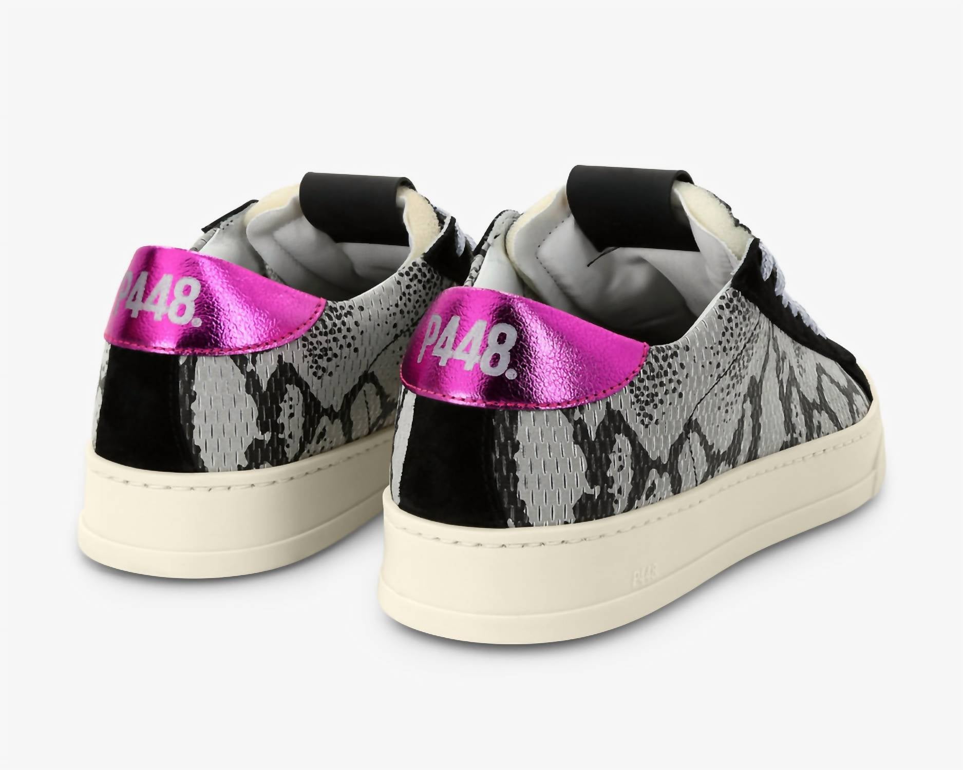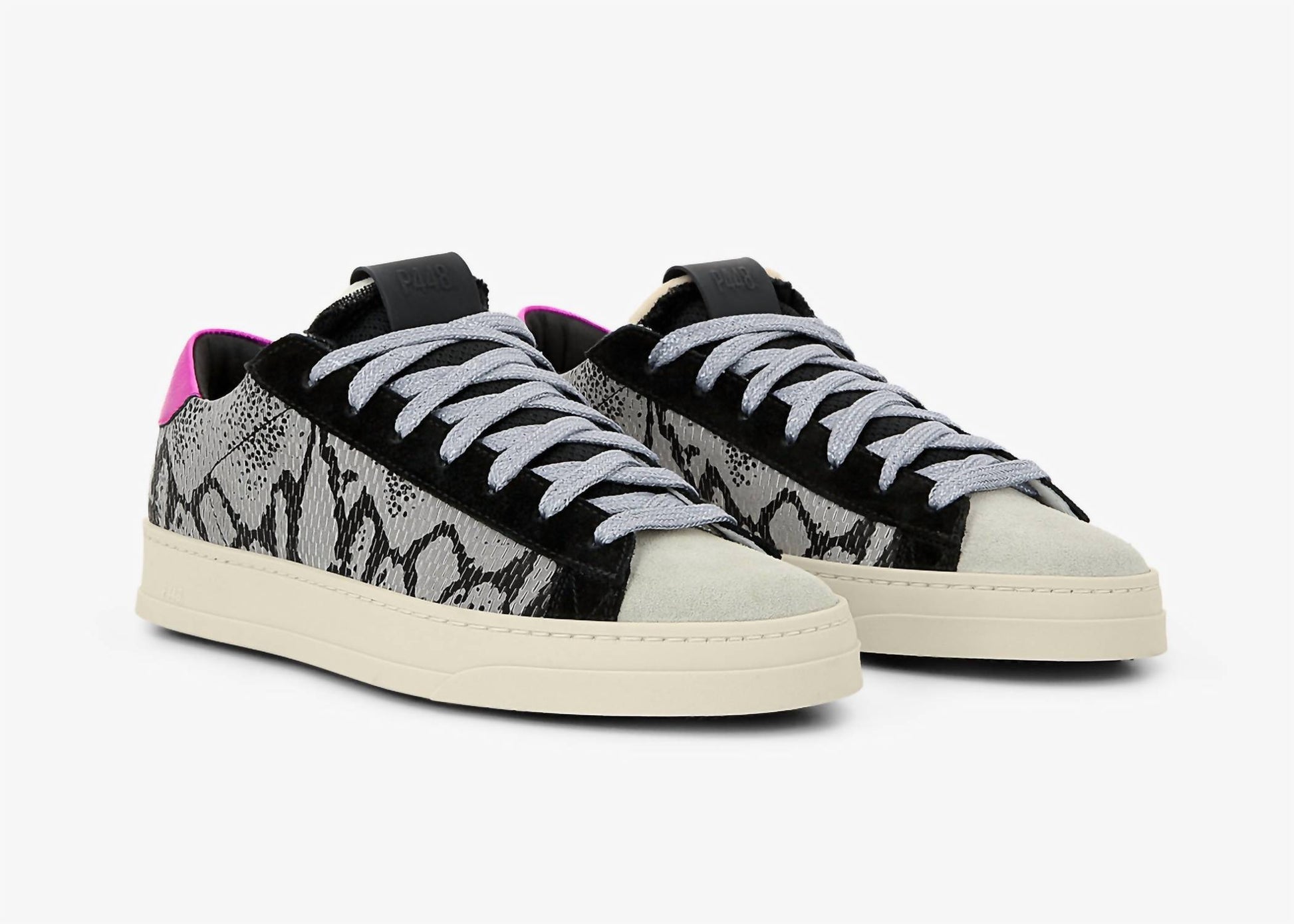 When fashion and function come together seamlessly. Introduce the P448 Women's Jack Cobra Sneakers, an everyday essential with a classic narrow low-top silhouette. Crafted from premium grey and black python-printed leather with a metallicized laser-cut detail, these sneakers feature a grey mesh tongue, black suede trim, and a grey suede toe. The vibrant fuchsia metallic leather heel tab and grey mélange lurex laces add a playful touch. Made in Italy, these sneakers combine style and craftsmanship for any occasion.