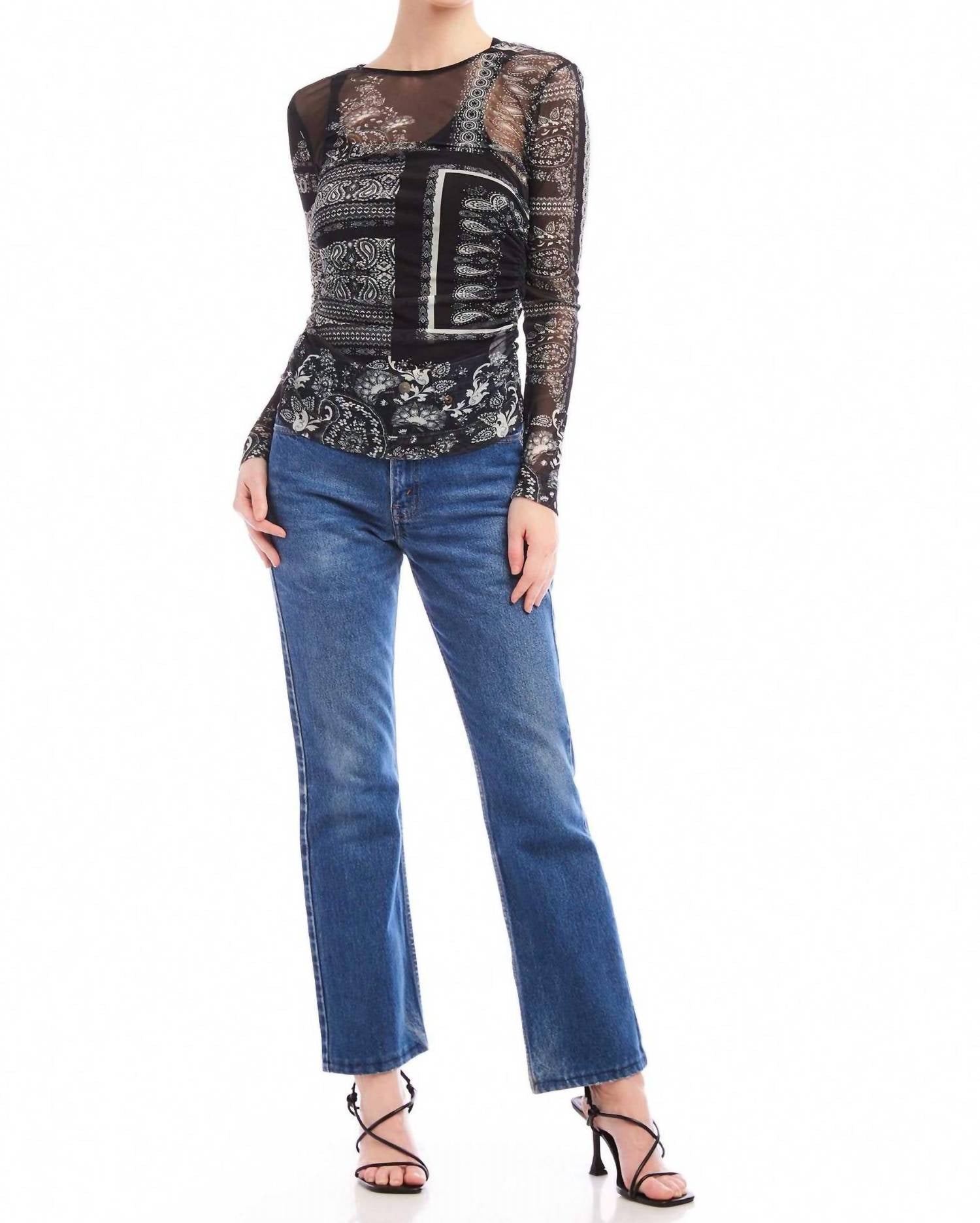 Pair this with your favorite jeans and slides for your next girls night out. Stay effortlessly stylish in the Alina Side-Shirred Mesh Top by Fifteen Twenty, featuring a trendy bandana print in black and white. This long sleeve, sheer top is made from 95% Polyester and 5% Elastane, crafted in the USA from Italian fabric, and measures 22 3/4 inches in length for size S. The shirred elastic sides ensure a flattering fit while the pull-on closure offers convenience and ease. Care is simple with a hand wash and lay flat to dry method, perfect for your spring wardrobe.