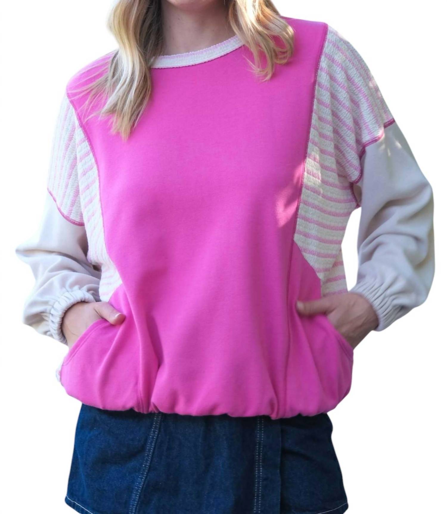 This pullover features patchwork sleeves, drop shoulders, and an oversized, loose fit. It has elastic details at the cuffs and hem, with oversized front pockets. The self is made from 70% polyester and 30% cotton, while the contrast is 50% cotton, 43% polyester, and 7% spandex.