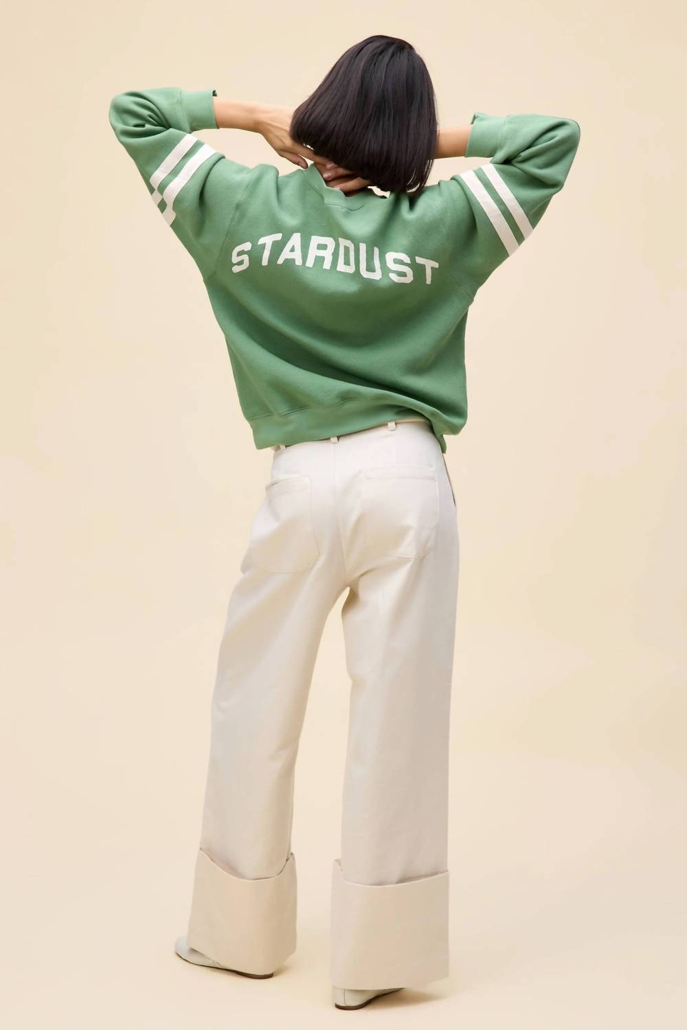 The ultimate go-to sweater, expertly crafted to provide the perfect combination of warmth and style. Its classic design and soft fabric make it a must-have addition to your wardrobe. Celebrate David Bowie's legendary Ziggy Stardust persona with this DAYDREAMER Ziggy Sweatshirt in green. Crafted from a durable cotton blend composed of 60% Cotton and 40% Polyester, this sweatshirt features a graphic design with distressed block letters and stylish sleeve stripes. The long sleeve crewneck style and pull-on closure offer both comfort and ease, perfect for any casual streetwear outfit. Care instructions include machine washing, making it a practical yet iconic tribute to an enduring music legend. Model wears a size small.