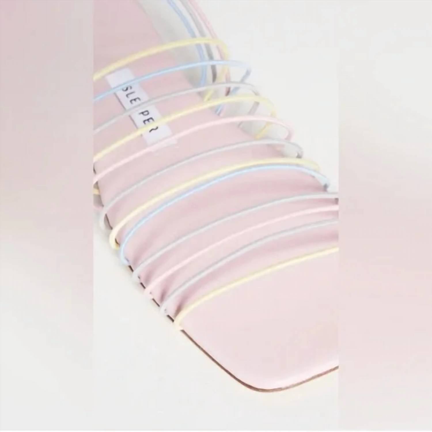 Classicly cute and all-day-wearable. We love this sandal. Step into summer with the Women's Macaroni Strappy Sandals by SLEEPER in a charming pastel pink. Crafted from 100% leather and rubber, these sandals feature spaghetti straps, a soft square toe, and a rubber sole for ultimate comfort. Designed with a flat heel, they are perfect for a beach day or a casual streetwear look. Ideal for adult women seeking both style and comfort during the warmer months.