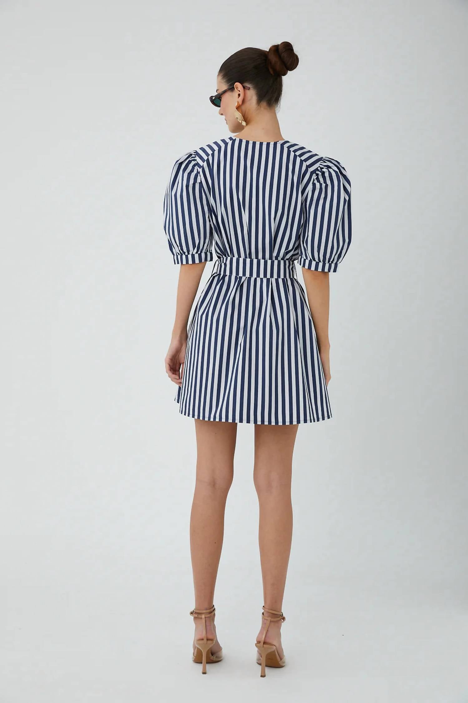 The kind of easy and flattering dress you'll be reaching for all season long. Elevate your summer look with the Dion Stripe Belt Dress by JS71, a chic choice in nautical navy and white. This mini shift silhouette features stylish puff sleeves and a crewneck, creating a relaxed yet flattering fit. Made from 100% cotton, it features a concealed front button closure, side pockets, and a sophisticated ratan belt buckle. Imported and machine washable, the dress measures 35 inches from shoulder to hem. Model is 5'9" with measurements 32" chest, 26" waist, 34" hips, wearing size small.