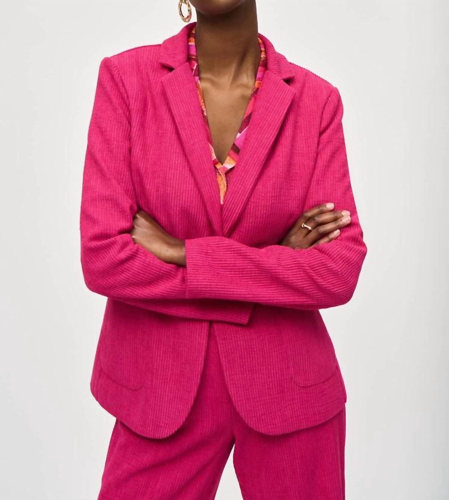 Texture and sophistication in Pink Punch. Features long sleeves. Expertly crafted from 100% polyester corduroy jacquard fabric. Notched collar and single button closure emphasize its fitted silhouette. Applied pockets and front darts add a touch of timeless charm. Care for this exquisite piece by hand washing it in cold water with like colors, laying flat to dry in the shade, and avoiding bleach, tumble drying, ironing, or dry cleaning.