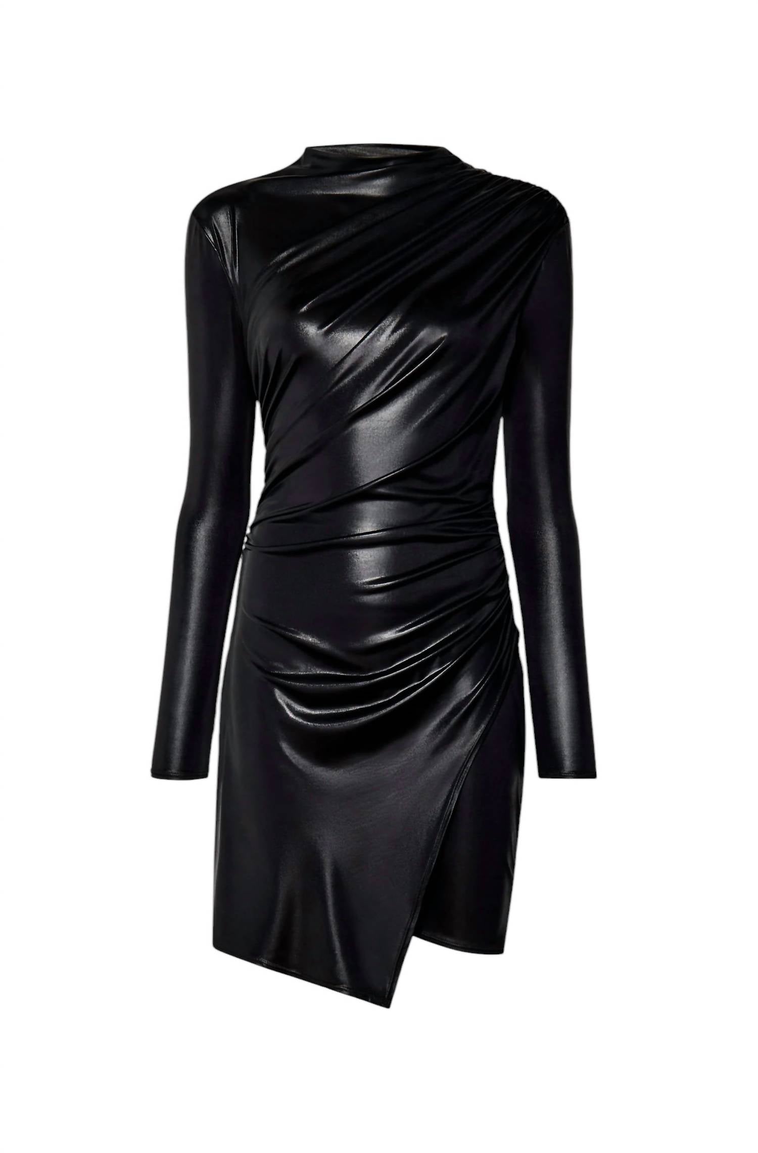 Elevate your wardrobe with the LAPOINTE Long Sleeve Ruched Dress in classic black. Crafted from a viscose blend (61% acetate, 39% viscose), this bodycon mini dress features a chic mockneck and a sleek zip closure. Designed for a slim fit, it highlights ruched details and an asymmetric neckline for a modern twist. Care: Hand wash cold or professional dry clean. Model is 5'10" and wearing a size S.