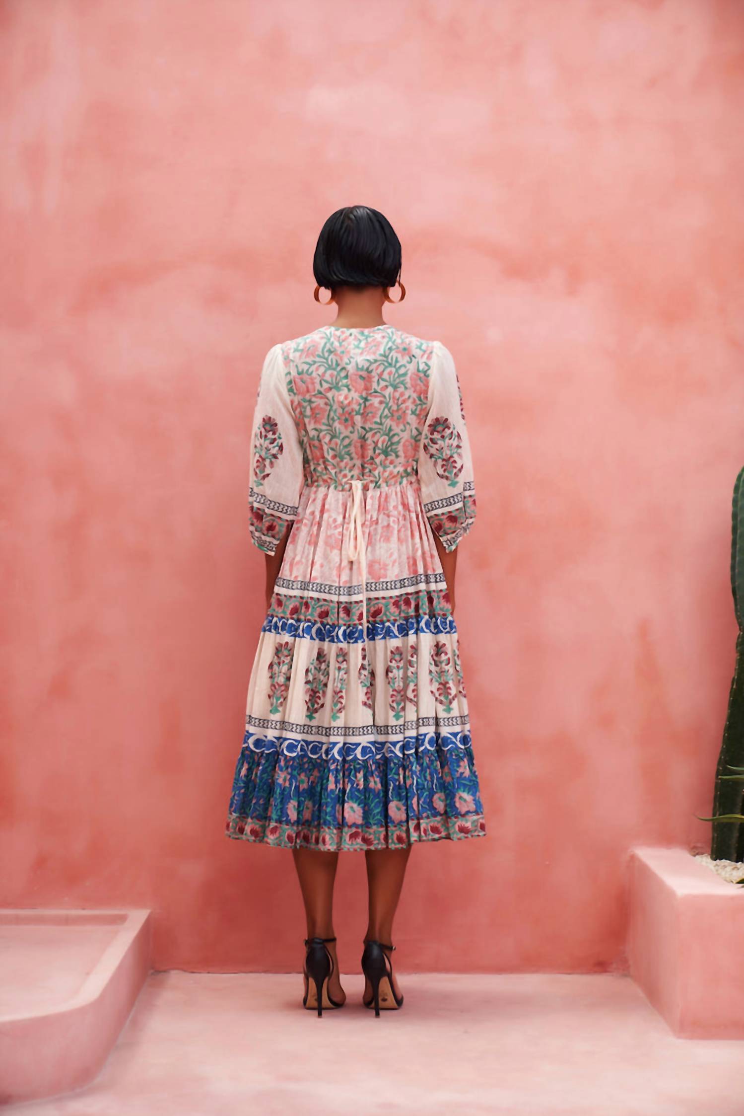 Just add slides or mules and you are good to go. Introducing the Peacock Flare Dress by Mo Maya, a stunning blend of boho chic elegance and intricate craftsmanship. This A-line midi dress features a V-neck and three-quarter sleeves in a vibrant multi-patterned cotton, perfect for summer vacations. Handmade with a detailed hand-block print, it offers a relaxed or fitted fit thanks to its tie elastic waist. Closure: Pull on.