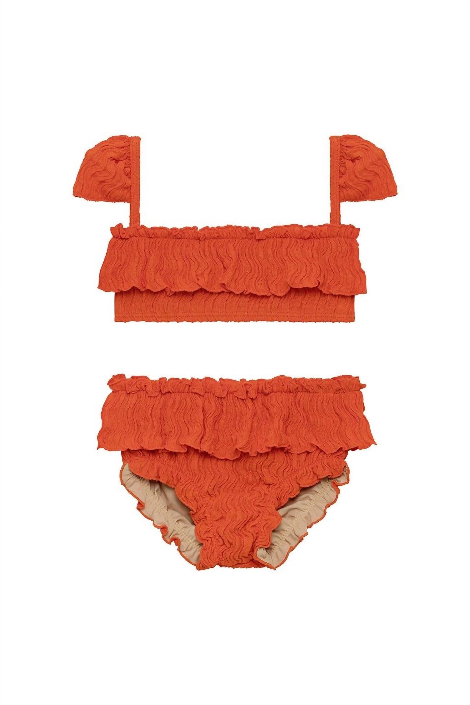 The Montce Girl's Mini Cabana Bikini Set in Tangerine is the perfect swimwear choice for your little one, designed with both style and comfort in mind. Featuring charming cap sleeves, adjustable straps, and a scrunched waistband, this bikini set provides a snug fit with cheeky coverage. The cotton blend material, composed of 55% TK Cotton, 40% Polyester, and 5% Spandex, offers a delicate touch, with fabric imported from Turkey. Ideal for beach days and boho chic summer adventures, this bikini set should be hand washed with care to maintain its vibrant solid pattern.