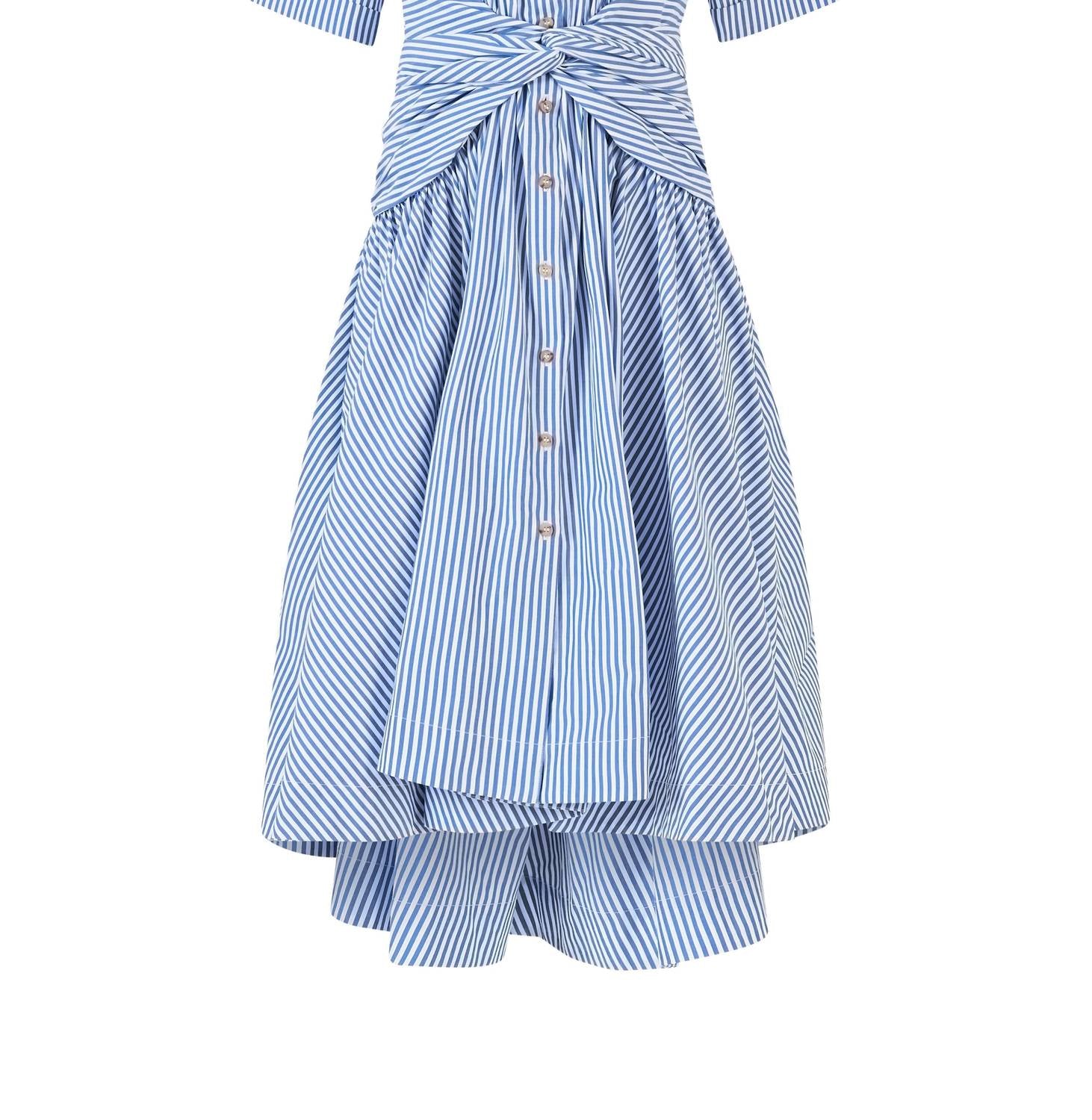 A midi dress so versatile, your options for wearing it are endless. Elevate your wardrobe with the Tie Shirt Dress by Rosie Assoulin, featuring a sophisticated cotton poplin stripe in blue. This midi-length dress is crafted from pure cotton and includes short sleeves, a collared neckline, and a classic button closure. Origin highlighting a modern twist, its standout asymmetrical hemline and twisted waist detail ensure a flattering silhouette, perfect for transitioning from casual to semi-formal wear. Care: Machine washable.