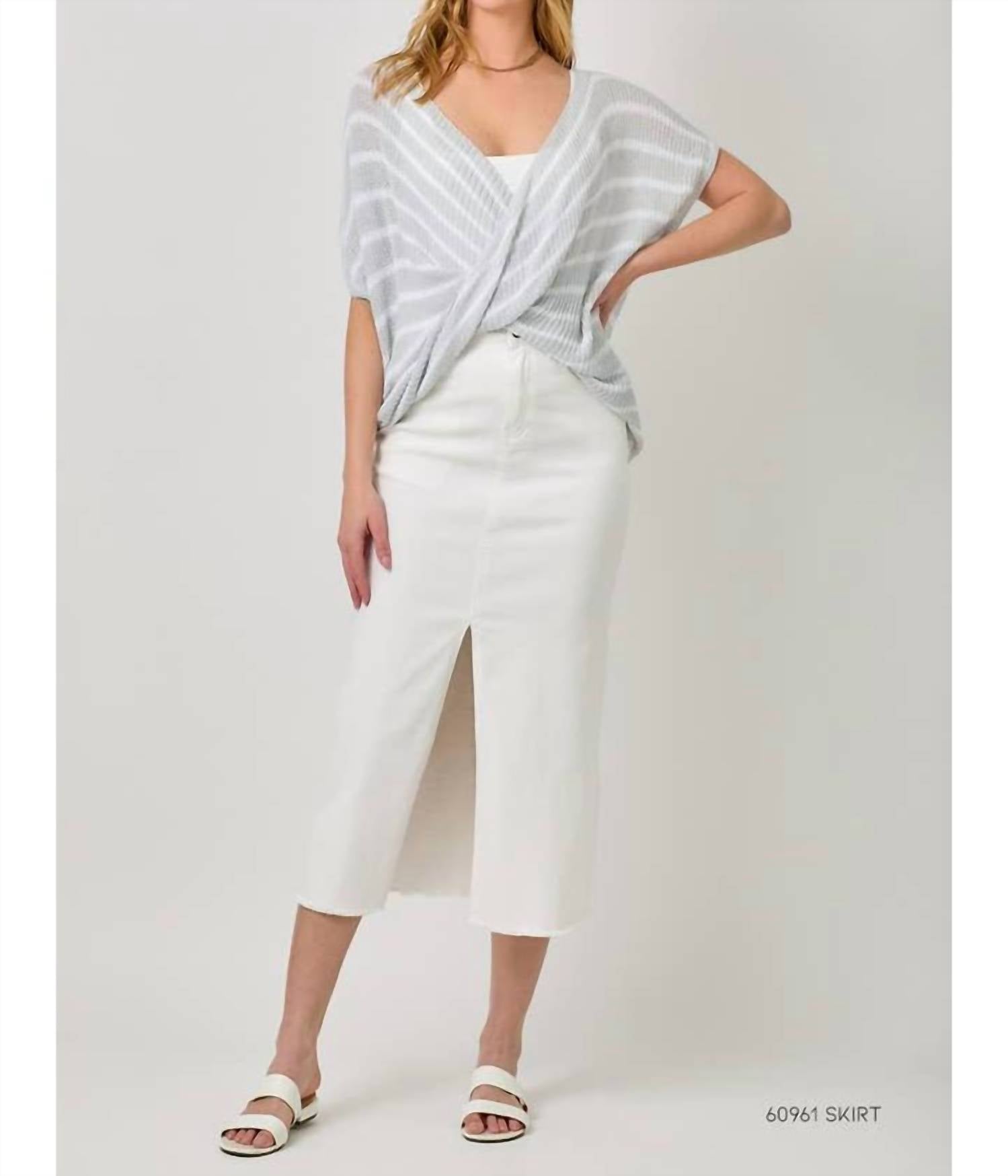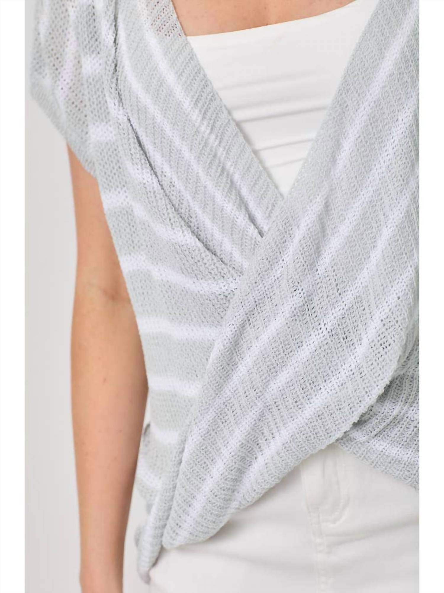 You'll be reaching for this comfy and classic v-neck sweater all season long. Introducing the Surplice Neck Stripe Sweater Top by Mystree, designed to elevate your spring wardrobe with its ice blue and grey textured stripes. This short sleeve sweater features a stylish V-neck and is crafted from a blend of 70% Acrylic and 30% Polyamide. It offers a convenient pull-on closure, perfect for a minimalist vacation look. Care instructions include machine washing and tumble drying for easy maintenance.
