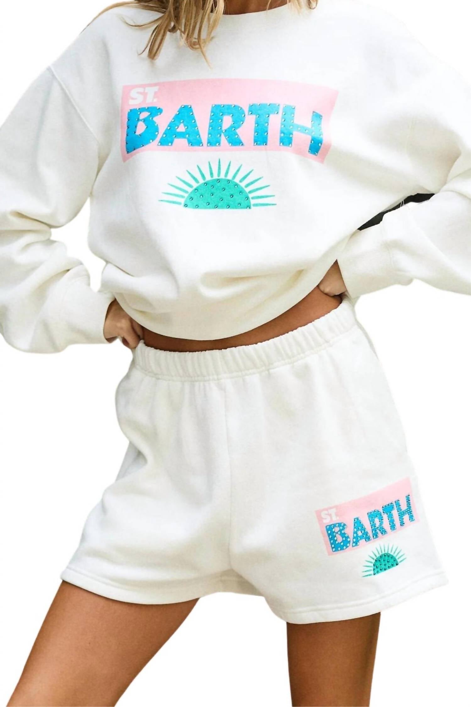 Discover the effortless style of the Vintage Havana St.Barths Shorts in a crisp white hue. Made from comfortable cotton, these high-waisted shorts feature a playful "St. Barth" graphic adorned with gem details. With a convenient pull-on closure and practical pockets, they offer both style and functionality. Ideal for women who love a blend of casual and chic, perfect for any summer adventure.