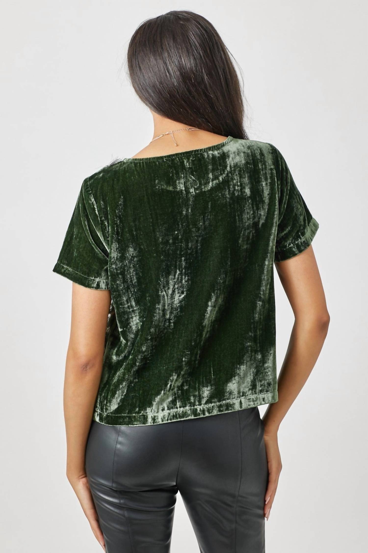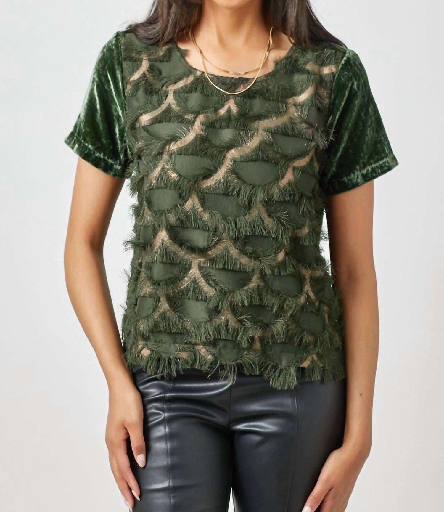 A timeless blouse that will never go out of style. Step out in style with the Mermaid Fringe Contrast Velvet Top by Mystree. This striking blouse in captivating olive features short sleeves and a scoop neckline, crafted with 100% polyester for a luxurious feel. The unique velvet and fringe design make for a statement look that's perfect for a dinner party. Enjoy the simplicity of a pull-on design and embrace the bold 90s fashion trend.