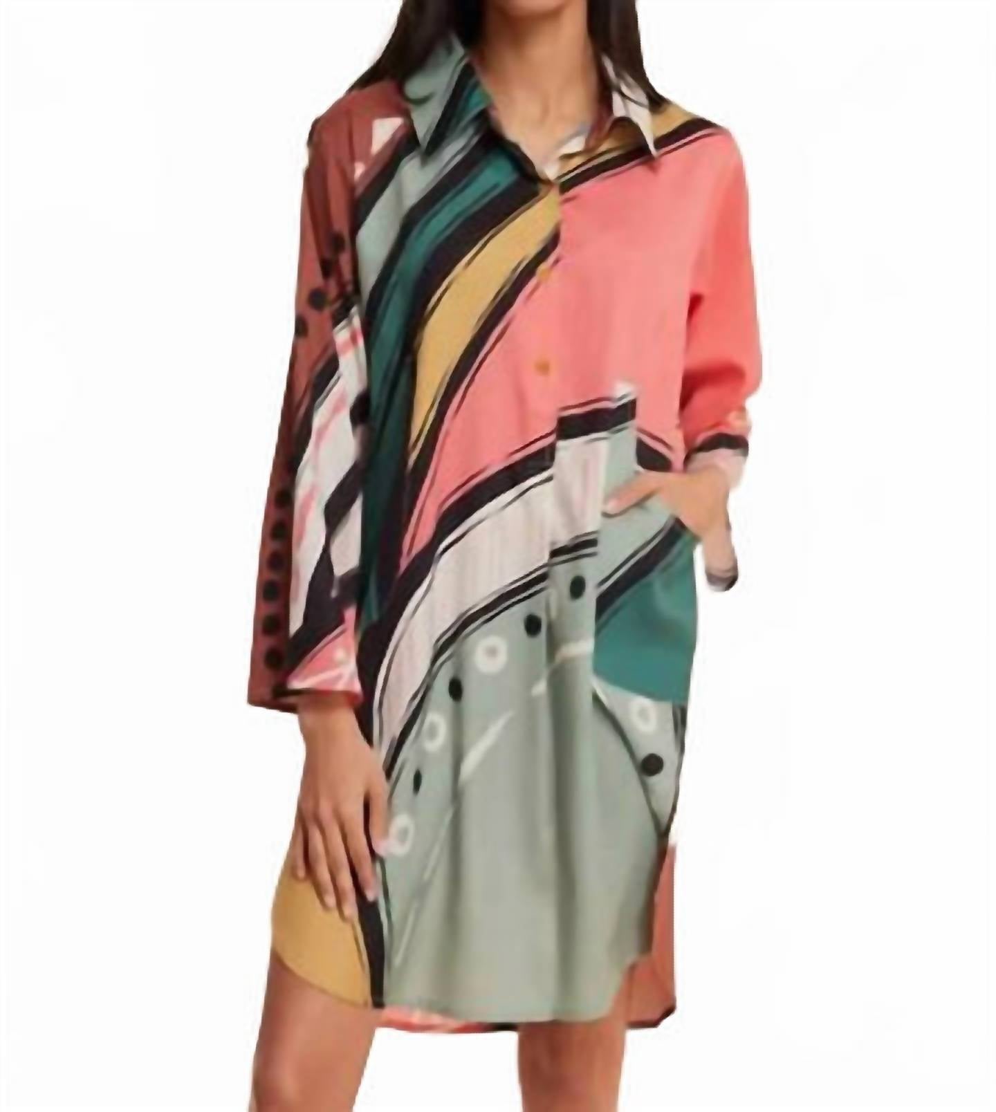 Comfortable and cute, this casual day dress has it all. This knee-length shirt dress offers both style and comfort, featuring a bold multicolor pattern with a nostalgic 90s vibe. Designed with long sleeves, a collared neckline, a buttoned placket, and side pockets, it combines a tailored look with practical details. Crafted from polyester, it’s a versatile piece you’ll reach for season after season.