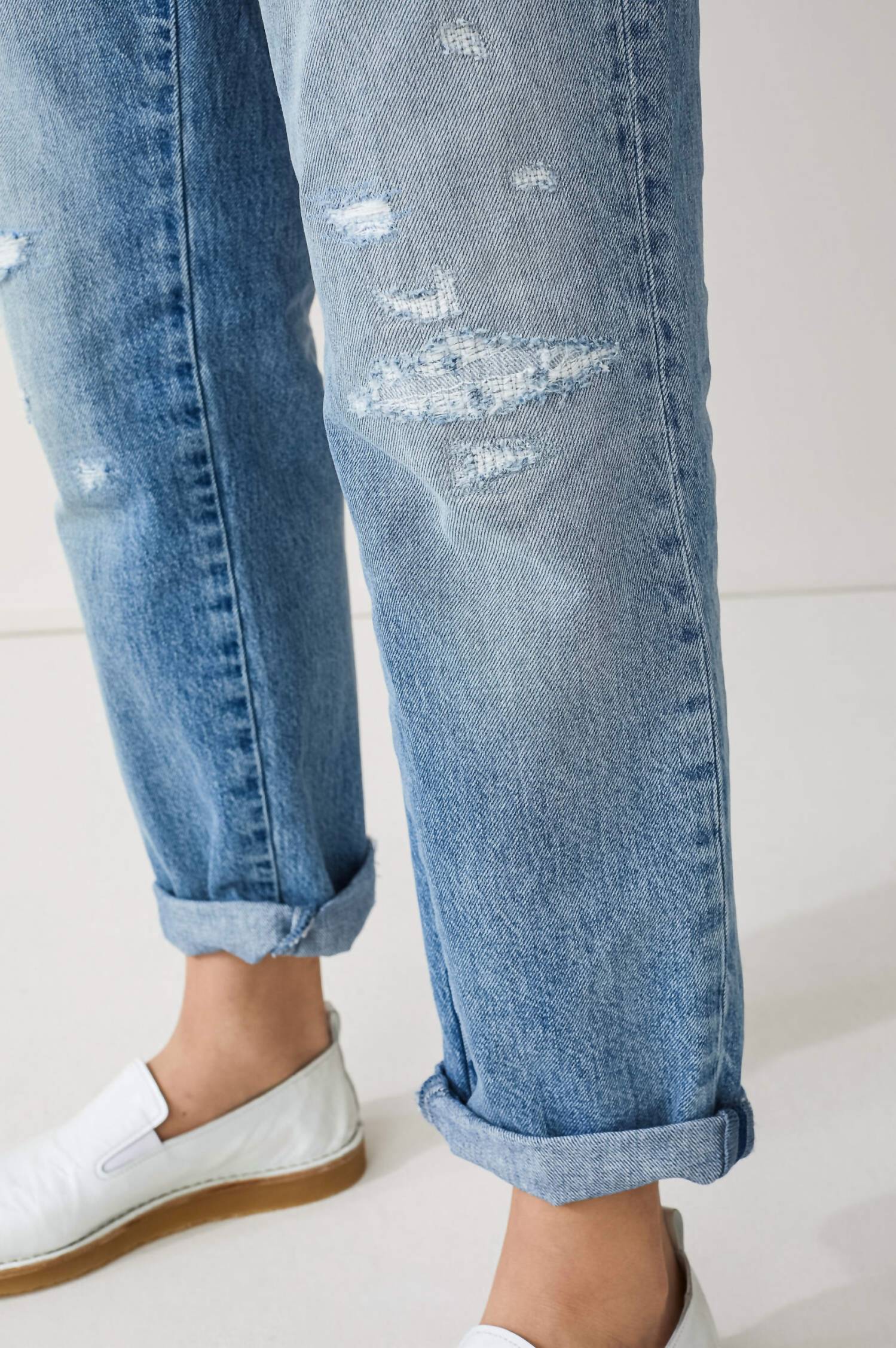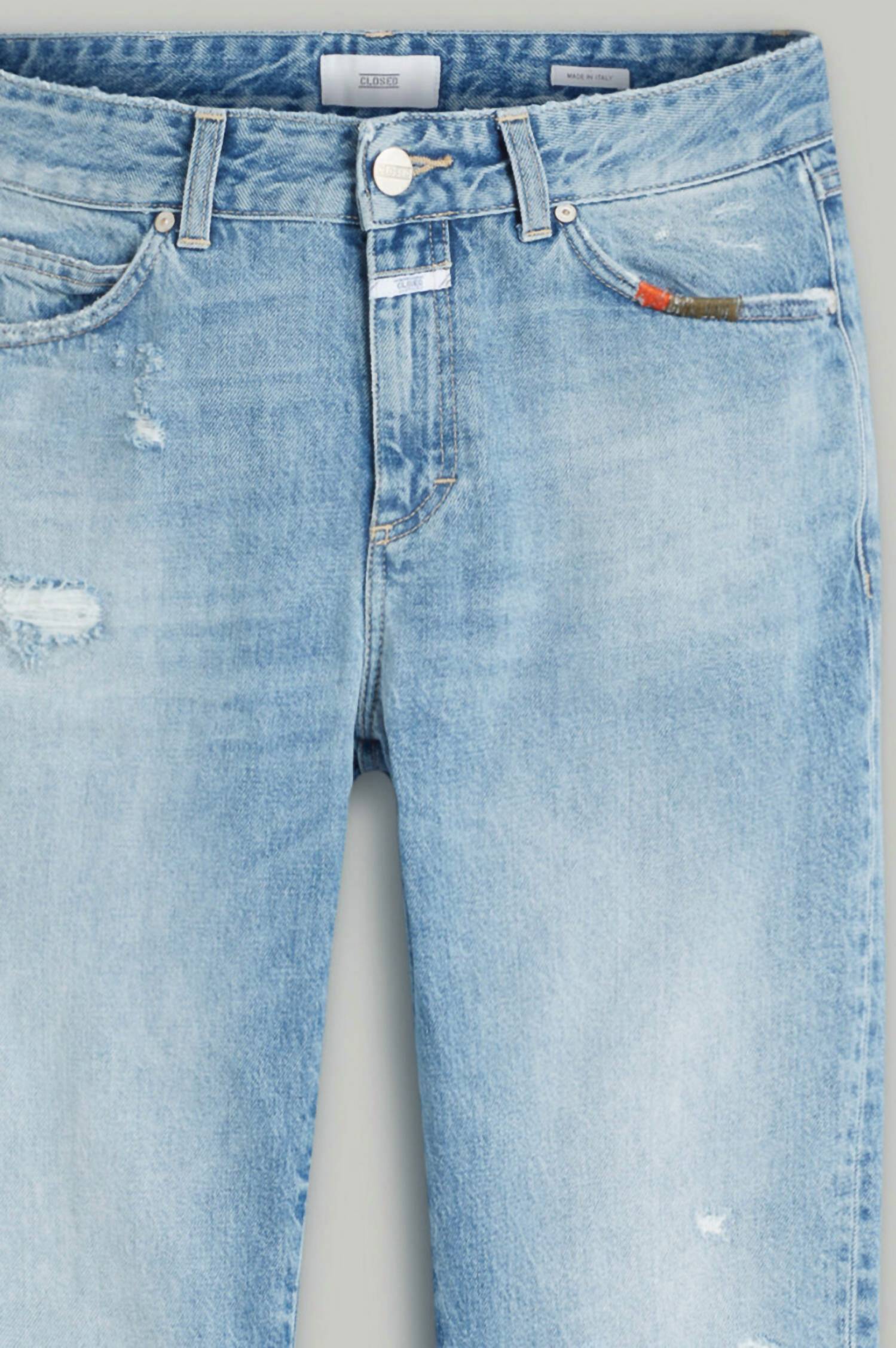 This classic straight leg jean has a perfect fit and goes with just about everything. Experience laid-back style with the Jay Jeans by CLOSED, featuring a relaxed fit and mid-rise waist. Crafted from 100% cotton denim in a light wash, these jeans boast a straight leg and a used look accentuated by contrast stitching. Their versatile 5-pocket design and signature button and zip closure with an embossed logo elevate the mid blue hue, while a leather patch on the back offers a classic touch. Care: Machine wash.