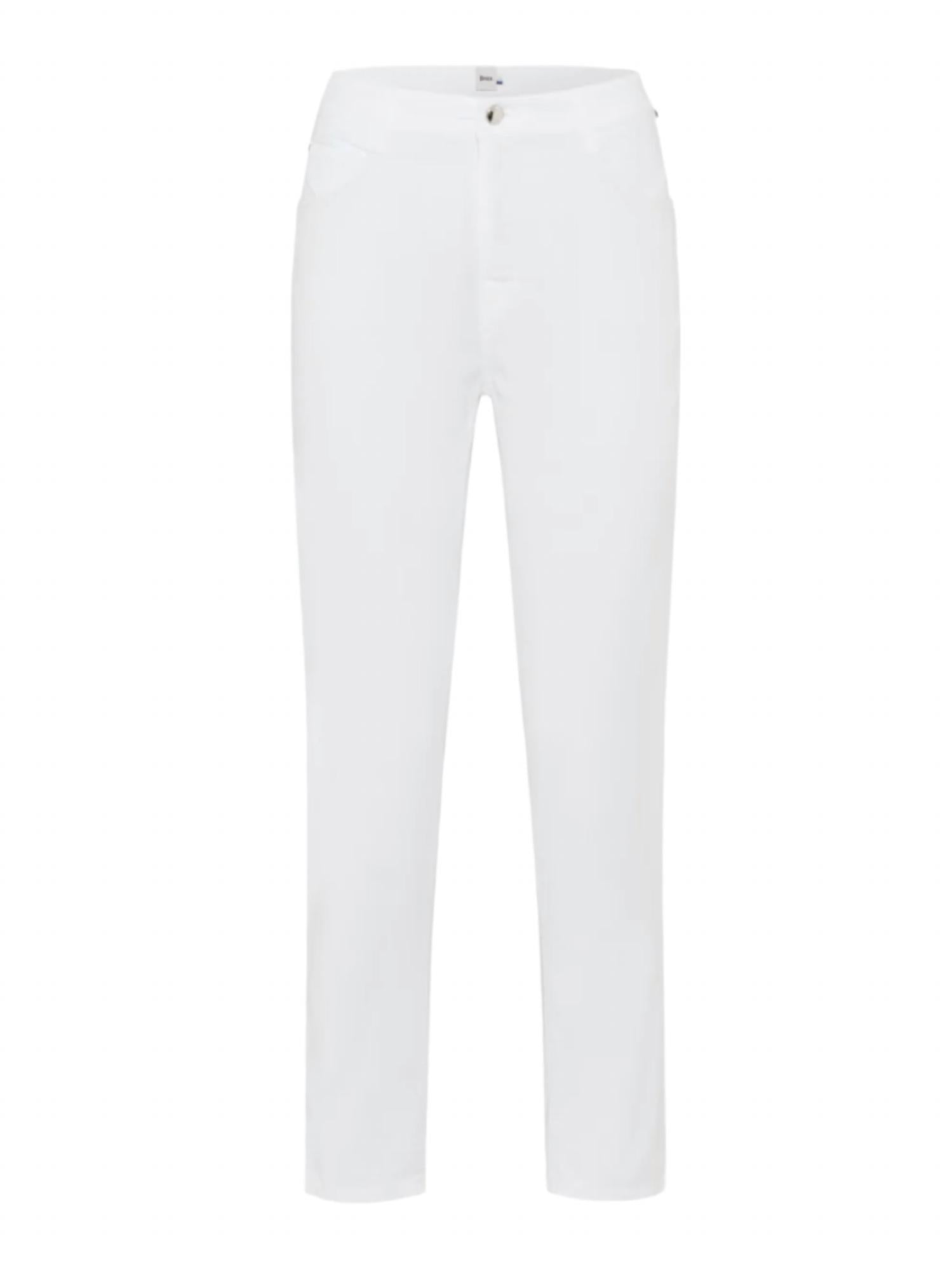 A perfectly tailored straight leg that you'll want in every color! Discover the Mary Cropped Straight Leg Pants by Brax, a minimalist addition to your summer wardrobe in timeless white. These women's pants feature a straight leg silhouette, high rise, and cropped length, crafted from a sustainable 78% Cotton, 19% Lyocell, and 3% Elastane blend. Featuring a classic five-pocket design and a secure button and zipper closure, these pants are both stylish and functional. Care for them easily with machine wash and lay flat to dry instructions, ensuring a luxurious feel season after season.