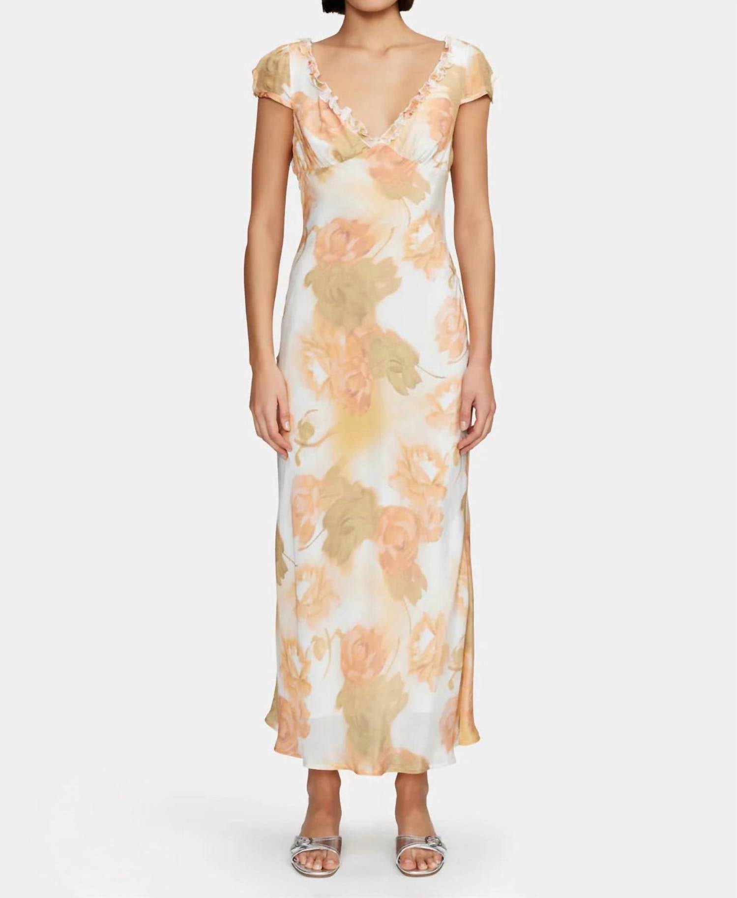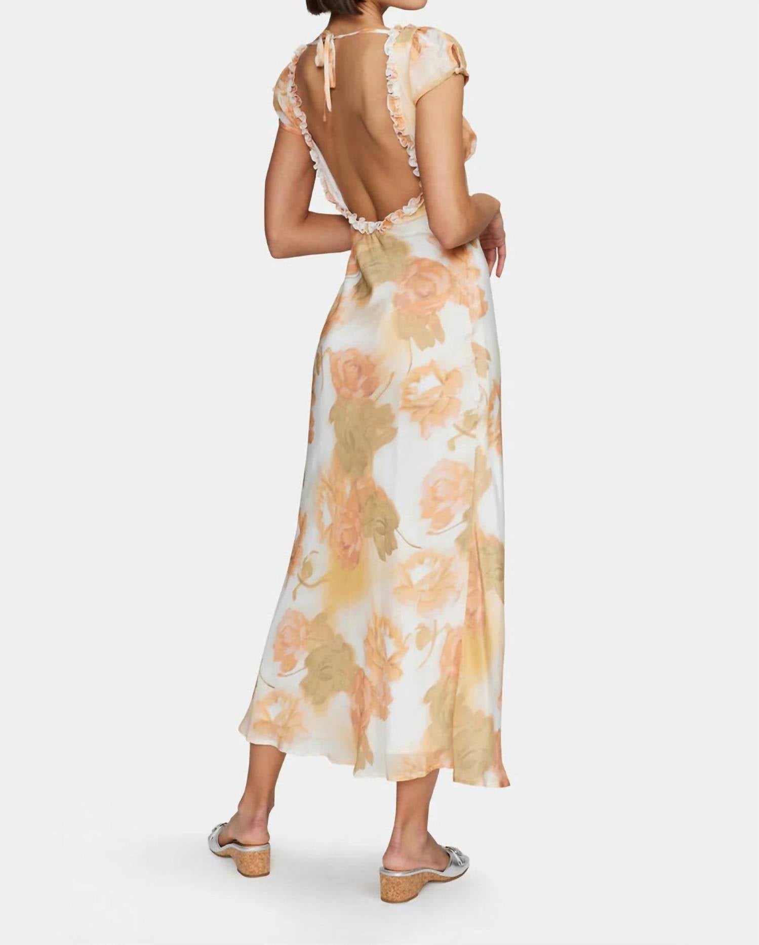 Just add slides or mules and you are good to go. Introducing the Lottie Midi Dress by Ownley, an elegant piece in a charming Peachy Garden hue designed for modern sophistication. This cap sleeve dress, crafted from 100% Rayon with a lining of 95% Polyester and 5% Elastane, features a V-neck and a flattering A-line silhouette that falls to a length of 133cm in size S. Adorned with polka dots, it boasts delicate button details on the sleeves and an alluring low back with tie closure, perfect for a dinner party or Mother's Day celebration. Care for this quiet luxury piece with a gentle cool hand wash, reverse side cool iron, and avoid bleach, tumble dry, and soaking. Model is 175cm tall, wearing a size small.