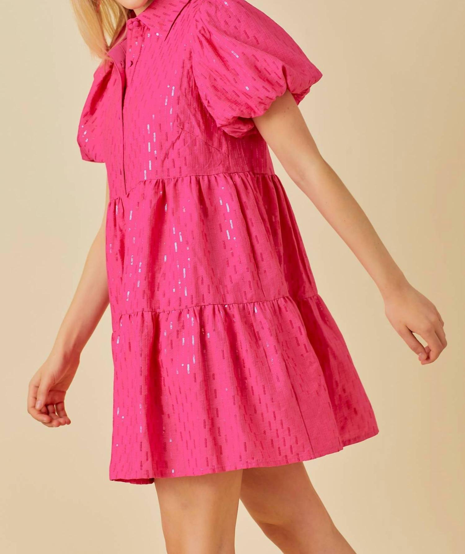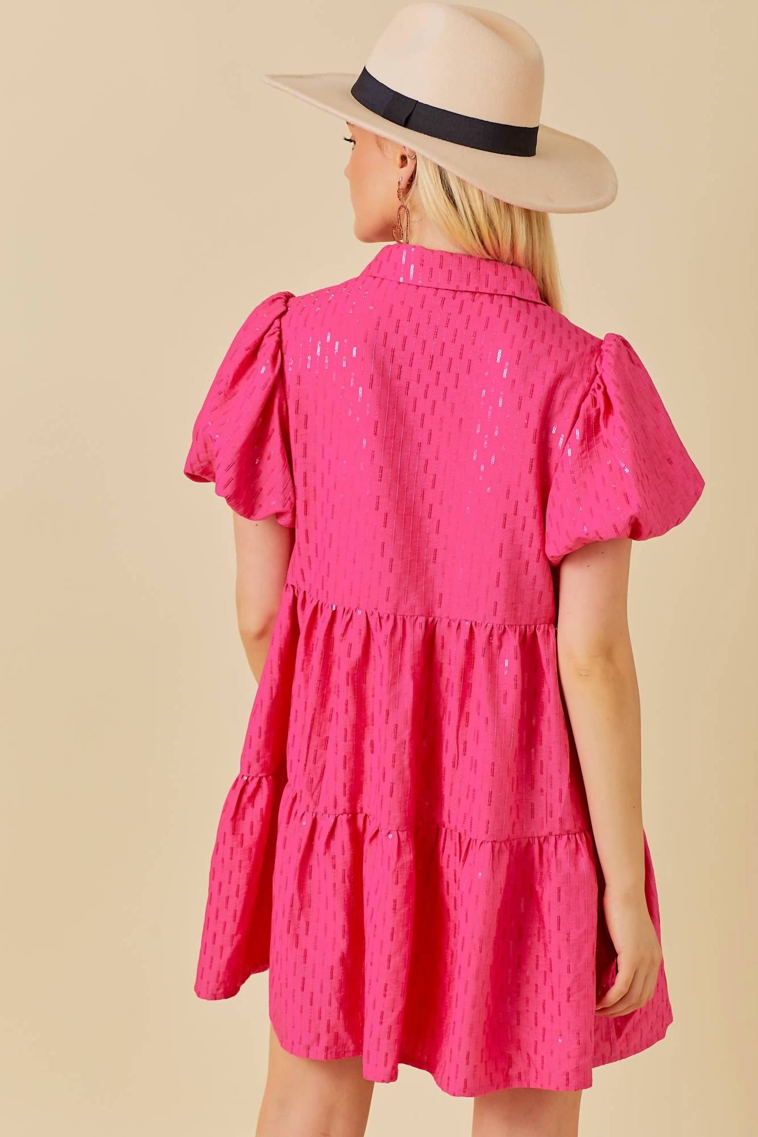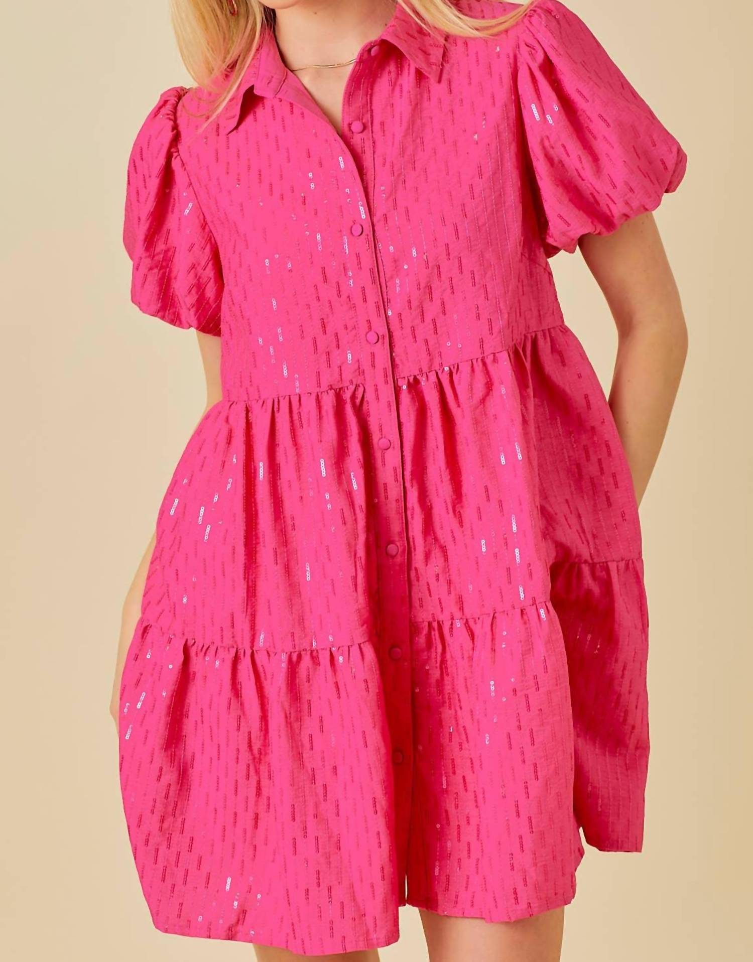 This sequin baby doll dress features puff sleeves and a button-down front with a collared neckline. The A-line shape fits all sizes, combining style with versatility. Ideal for special occasions, the dress is designed to stand out.