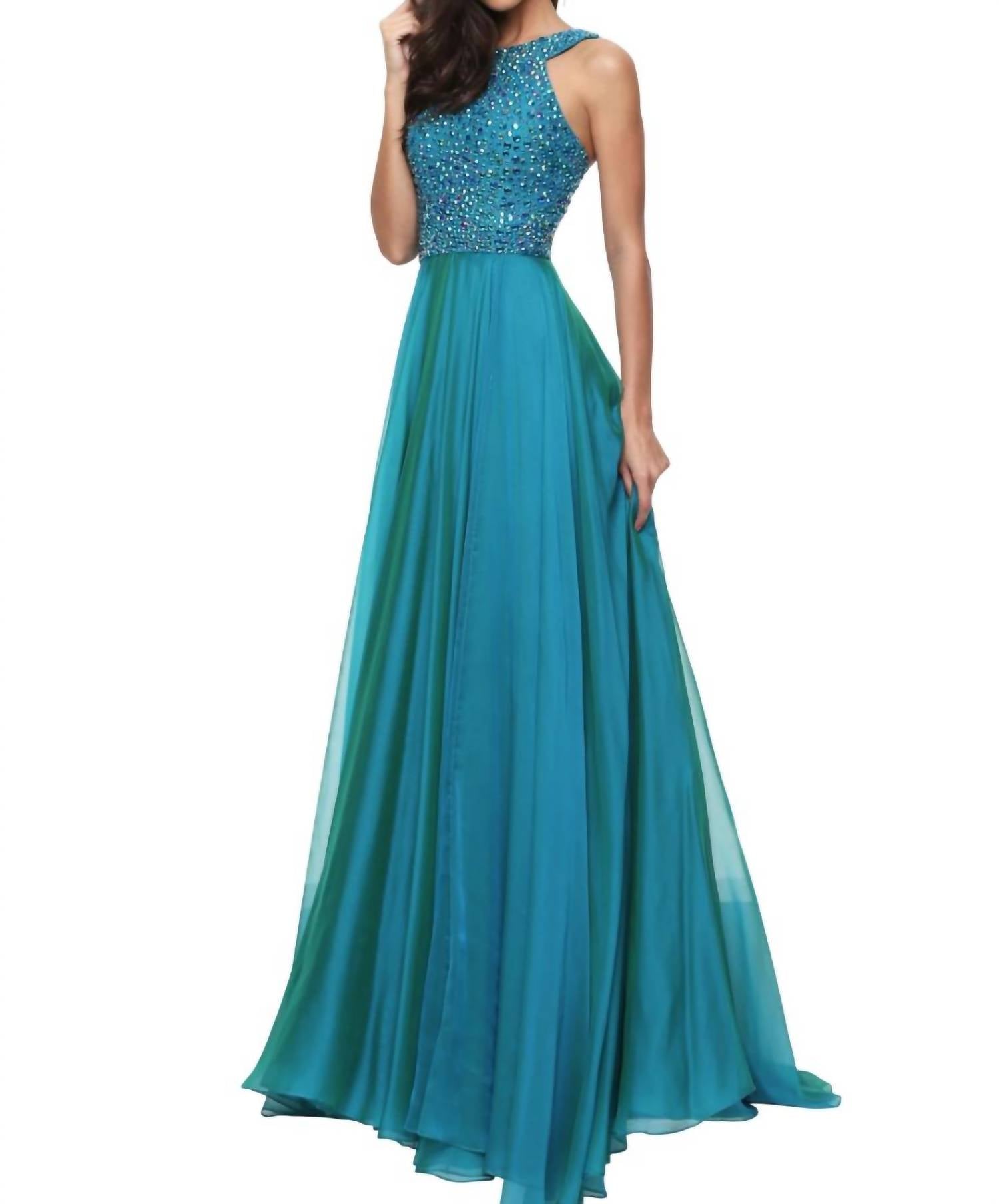 Features a beaded bodice. Chiffon skirt. Floor length. Sleeveless.