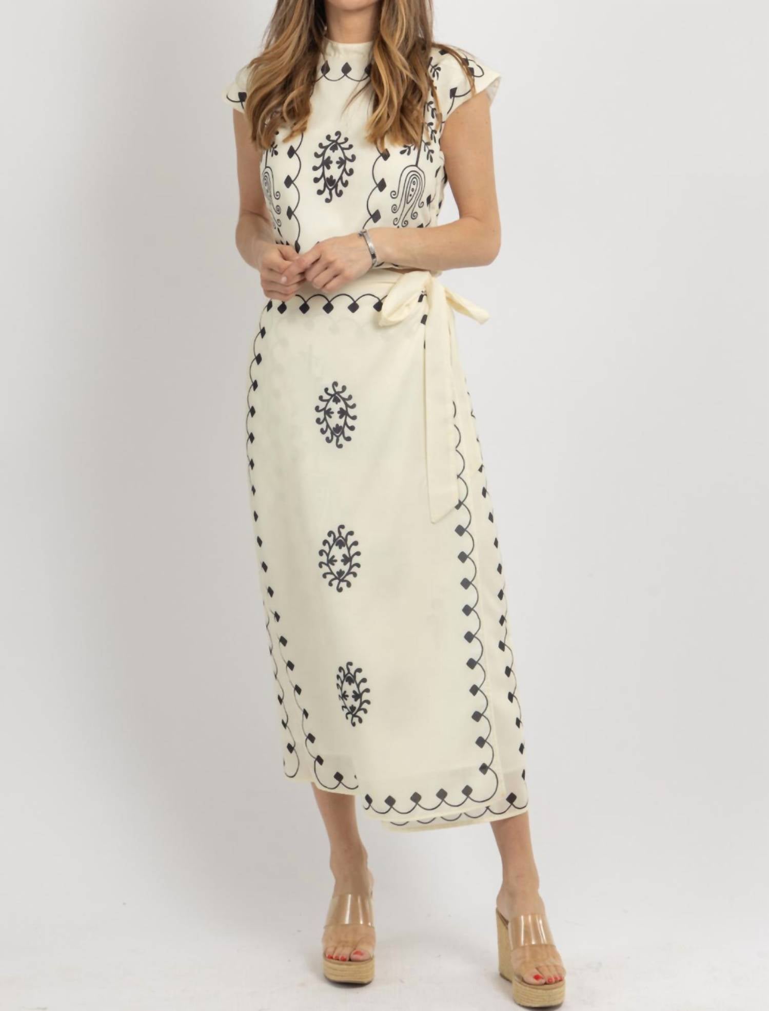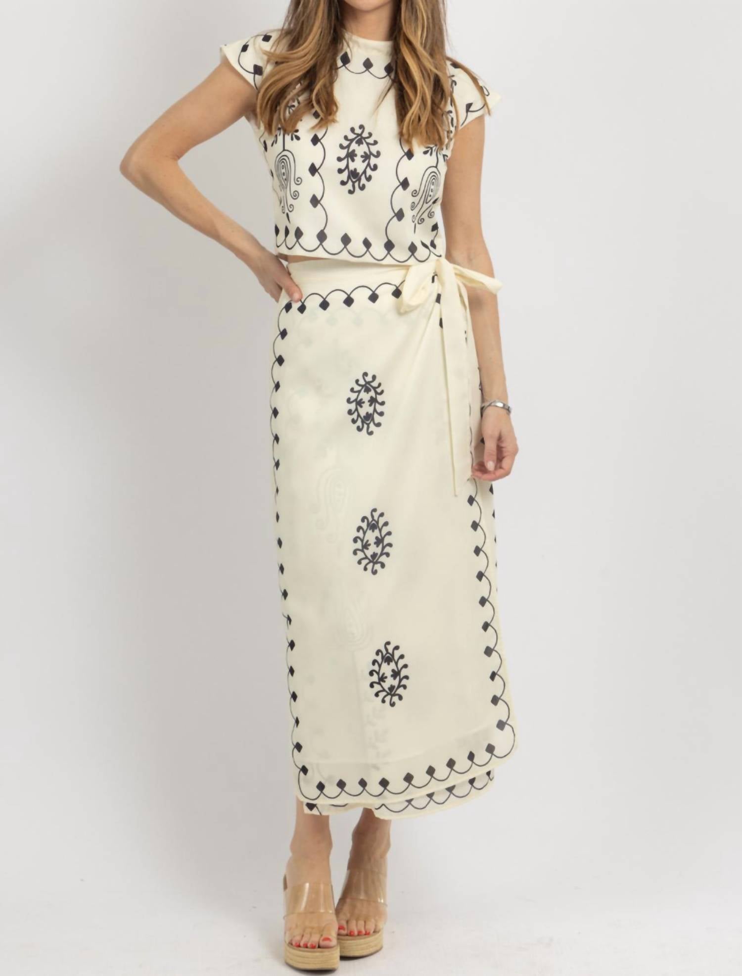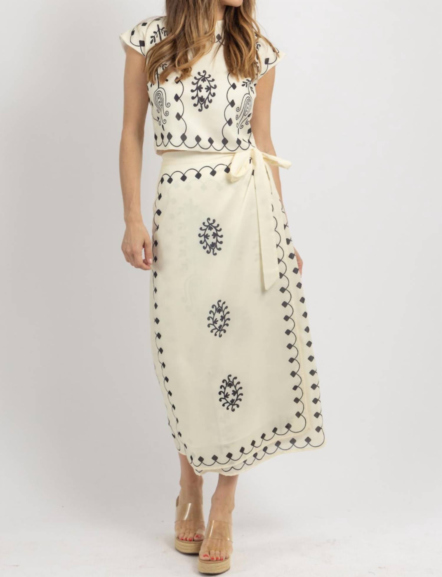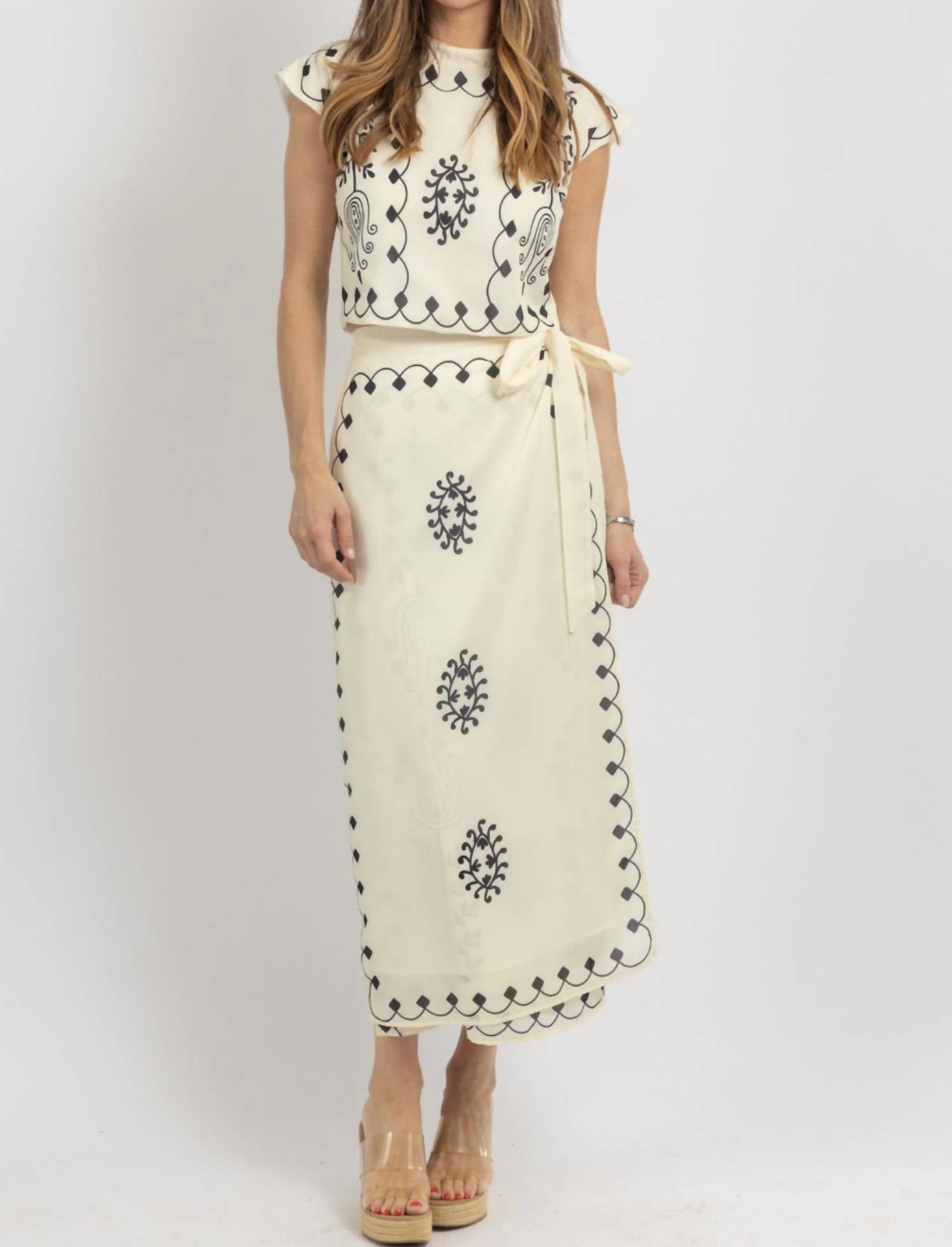 Discover the Kamora Skirt Set by Ooh Fashion, a stylish choice in a refreshing aqua hue. This set includes a sleeveless top with button detail and a coordinating wrapped maxi skirt, both featuring a striking geometric pattern. Crafted from 100% Polyester, it offers a blend of comfort and elegance. Closure: Button closure. The model, is wearing a size small and stands 5'8" with a dress size of 2.