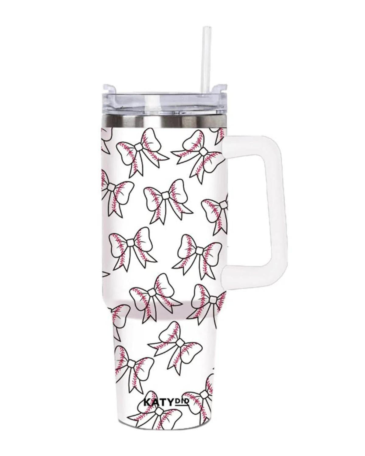 Presenting the Baseball Bow 40 Oz Tumbler Cup with Handle by Katydid, an essential for baseball enthusiasts who appreciate a coquette aesthetic. Made from durable stainless steel, this white tumbler ensures all-day chill or heat for your drinks. Designed with practicality, it features a screw-on plastic top with a straw opening and an adjustable straw cover, complemented by a reusable plastic straw for convenience. Dimensions are 10" in height, with a 3" width and depth, fitting seamlessly into your car cup holder. Dishwasher safe, this tumbler is your perfect travel companion.
