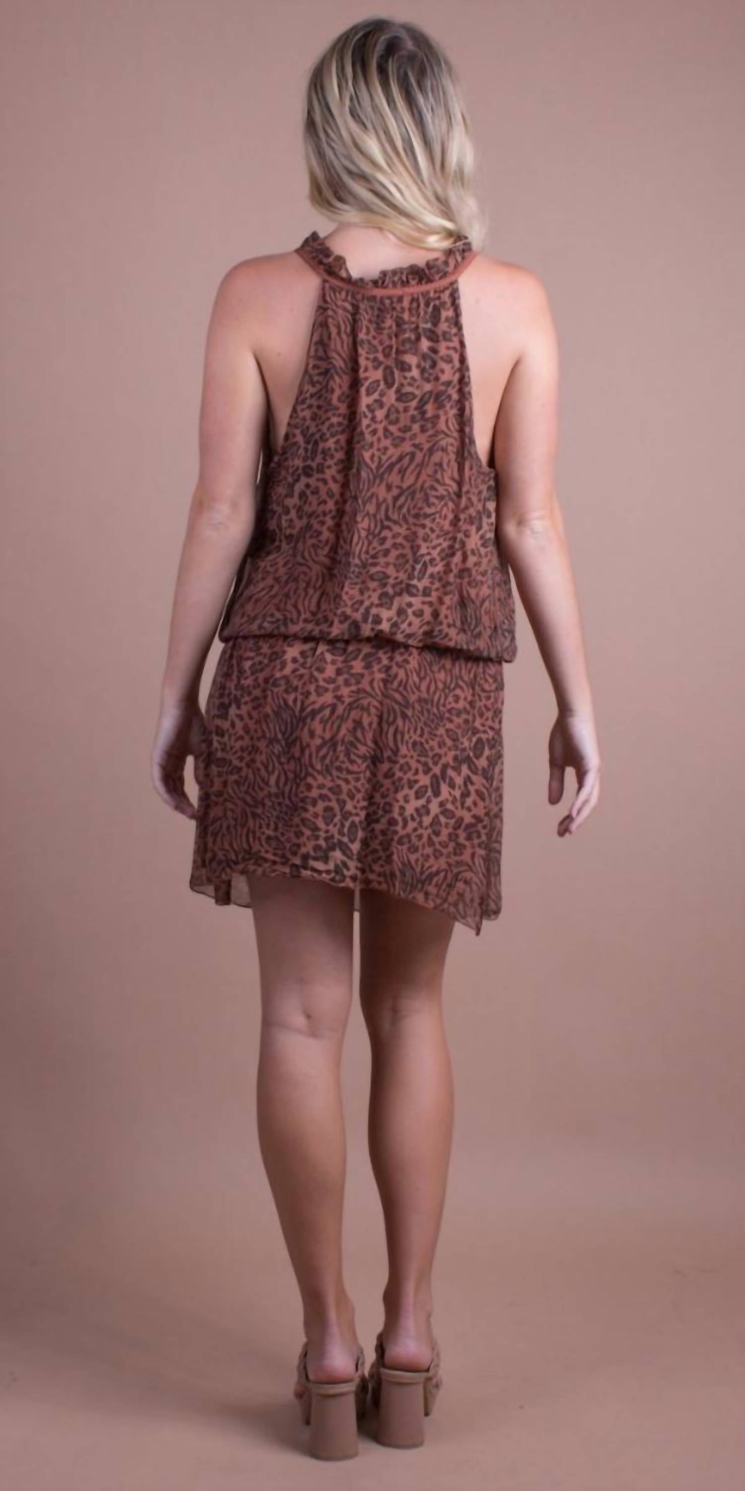 The perfect mini dress for those warmer months. Discover the Mariola Safari Print Mini Dress by GIGI MODA, a captivating piece ideal for your holiday party wardrobe. This sleeveless dress made from a luxurious viscose blend features an exotic animal pattern in a striking rust color. Crafted in Italy, it boasts a ruffle racer back, V-neckline, and an elastic ruched drop waist style with a convenient pull-on closure. Care: Hand wash and line dry, ensuring lasting elegance for your summer occasions.