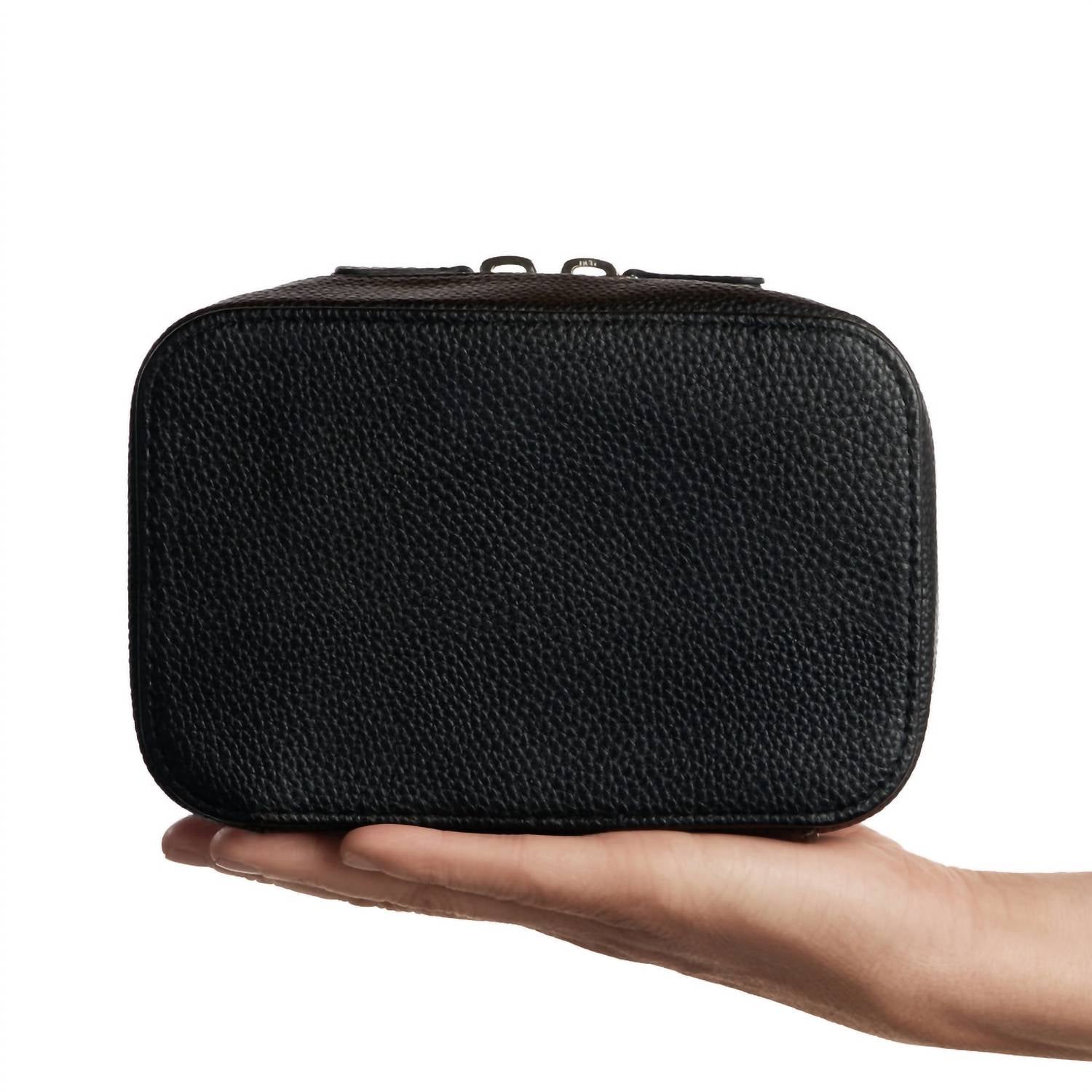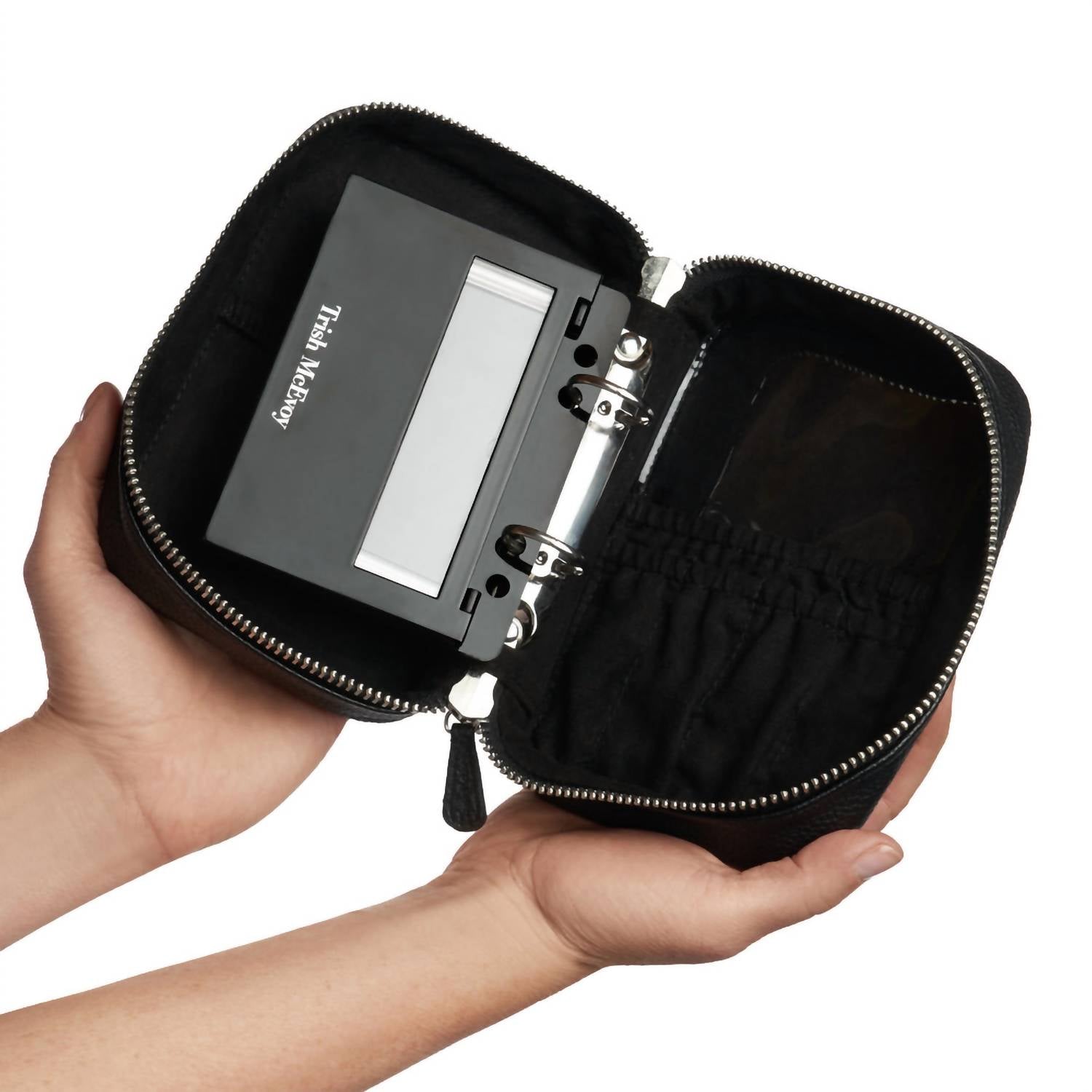 A stylish bag to use for makeup, skincare, or anything else you might want to travel with in style. Experience the elegance of the Women's Makeup Planner by Trish McEvoy, crafted from luxurious pebbled faux leather in a timeless black. This all-in-one customizable beauty organizer is designed to elevate your makeup routine. Measuring 4.5" in length, 2.5" in width, and 6" in height, it offers ample space while remaining portable and chic. A must-have accessory for the modern beauty enthusiast.