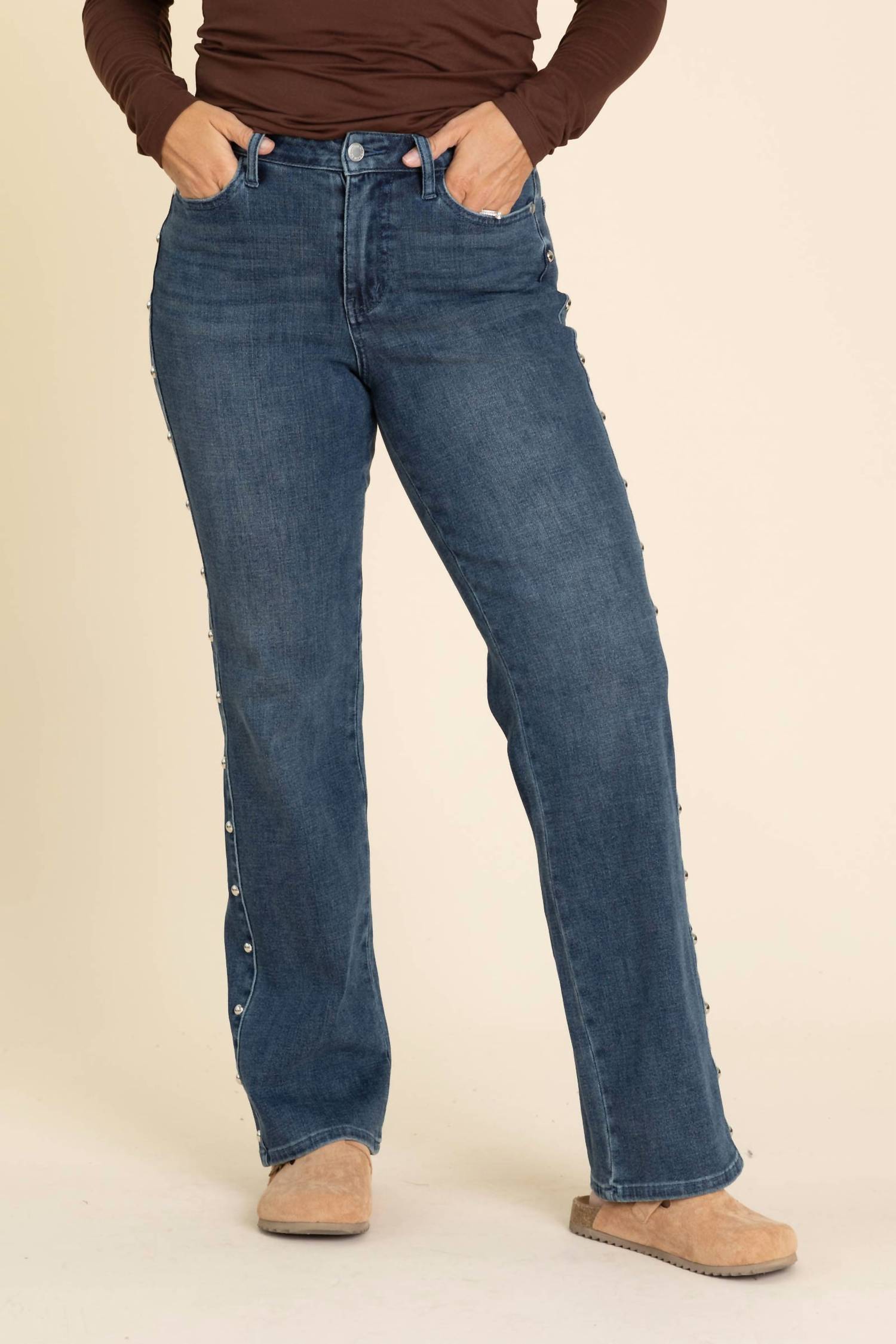 Pair these straight leg jeans with flats, sandals or even heels! You can't go wrong. Introducing the Judy Blue Straight Dome Studs Detail Jeans, a statement piece in dark denim designed for the fashion-forward woman. These jeans boast edgy dome stud details and a versatile solid pattern in a comfortable cotton blend. Featuring a high-rise cut and relaxed straight-leg fit, they're equipped with pockets and a convenient zip closure for functionality. Ideal for minimalist spring trends, these jeans offer effortless style for a dinner party and can be easily cared for with machine wash and tumble dry.