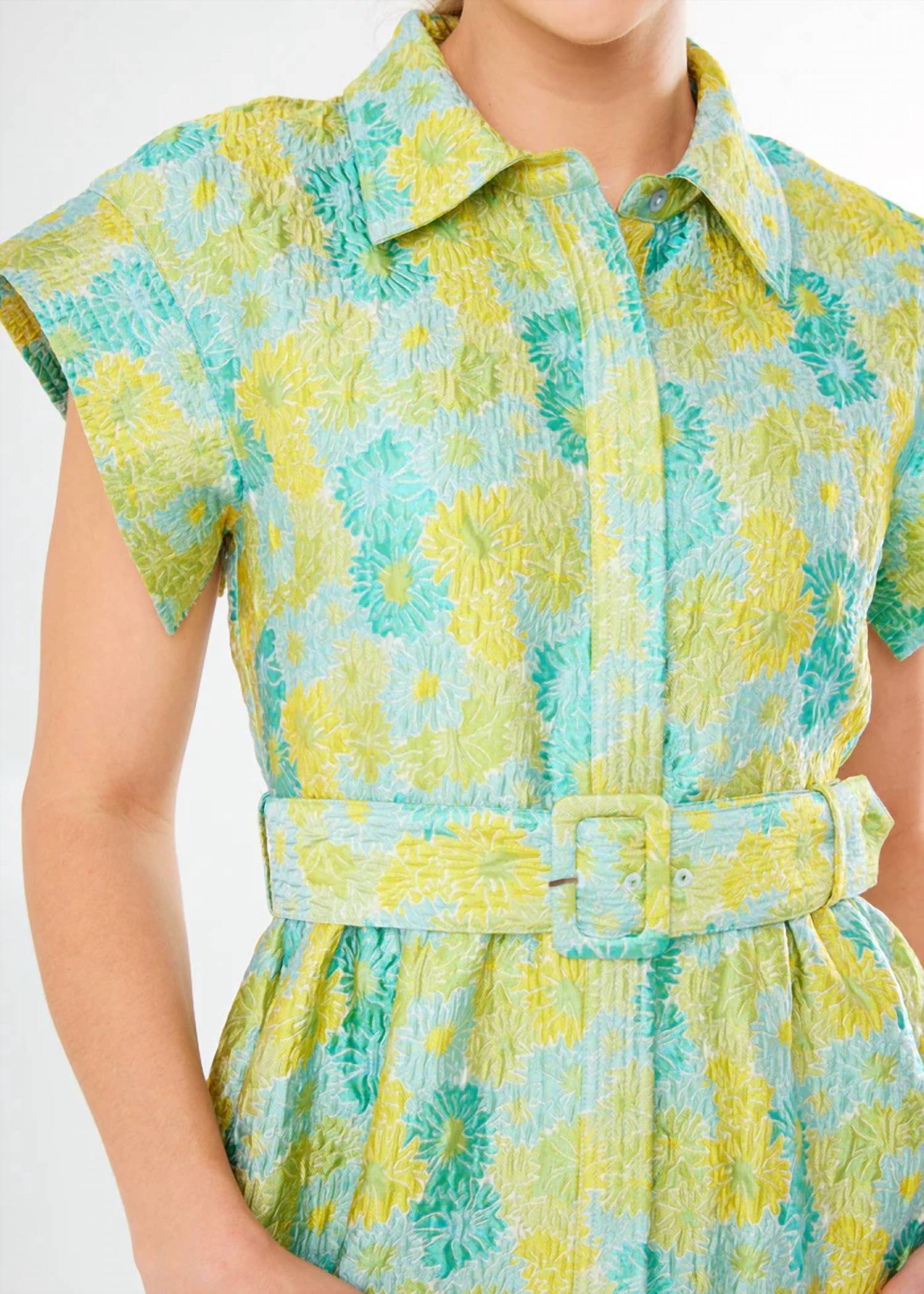 A maxi dress that is just as cute as it is comfortable. Crafted in a luxurious green sunflower jacquard, our new Harper Gown offers a timeless silhouette that’s perfect for formal occasions throughout the season. Fit for a summer wedding or gala, this collared gown exudes sophistication and grace. With its classic design and striking floral pattern, the Harper Gown ensures you make a statement while maintaining an air of elegance, making it a perfect choice for your next special event. Collared neckline Short sleeves Hidden front button placket Removable self-belt Adjustable belt with 3 eyelets In-seam pockets Full Length Fabric Content: Jacquard, 80% Polyester, 20% Nylon