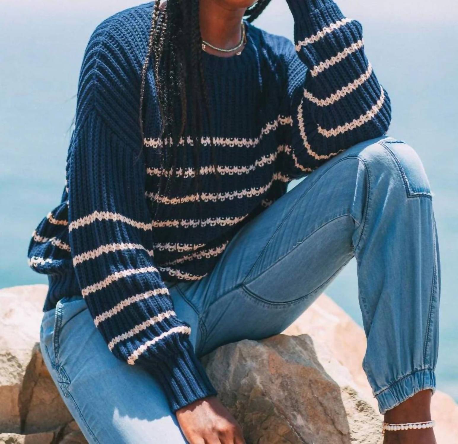 Introducing the Nautical Sweater by Electric & Rose, a stylish addition to any wardrobe with a stripe indigo/ivory pattern. Crafted from 100% cotton, this long sleeve piece offers undeniable comfort and versatility. It features a classic crewneck and a convenient pull-on closure, making it perfect for pairing with both swimsuits and jeans. Care instructions recommend dry cleaning to maintain its quality.