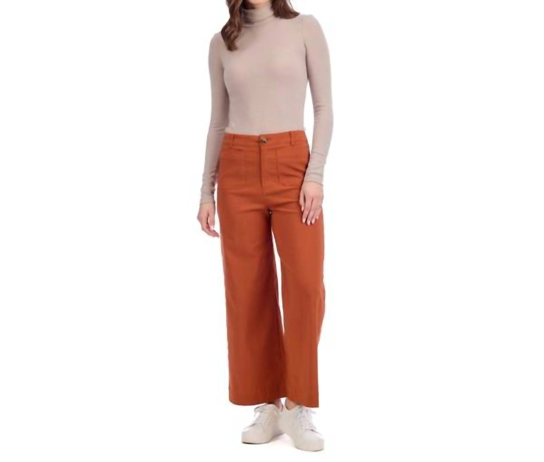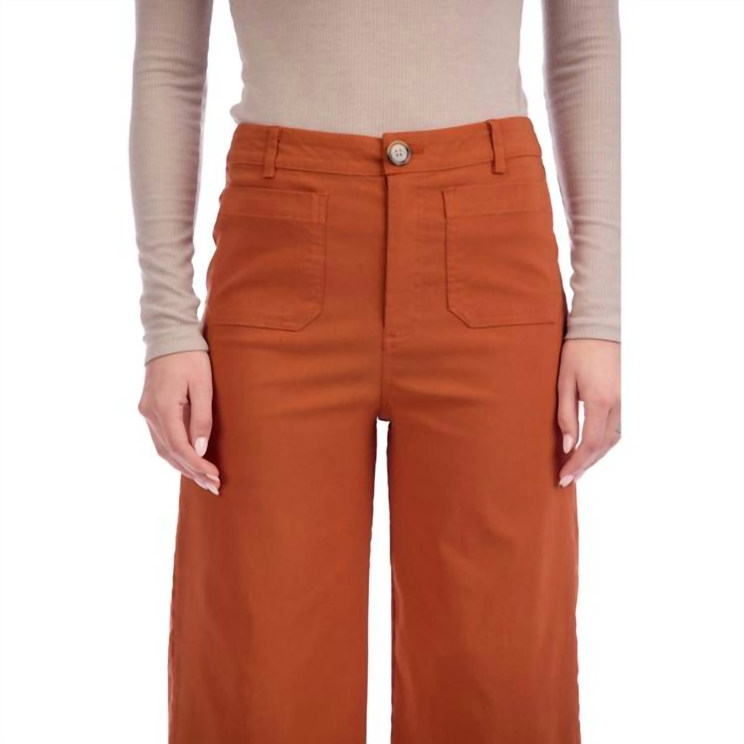 Just as cute as they are comfortable. Introducing the Jake Wide Leg Pant by Mudpie, a stylish choice in rust for any occasion. Crafted from a comfortable and stretch-enhanced cotton blend (73% cotton, 25% polyester, 2% spandex), these pants feature a regular fit with a high-rise, wide-leg silhouette. The design is completed with functional front and back patch pockets and a secure zipper-fly with a tortoise button closure. With an inseam of approximately 26 3/4" on size small and easy-care machine wash with line dry, these pants offer durability and style in one minimalist package.