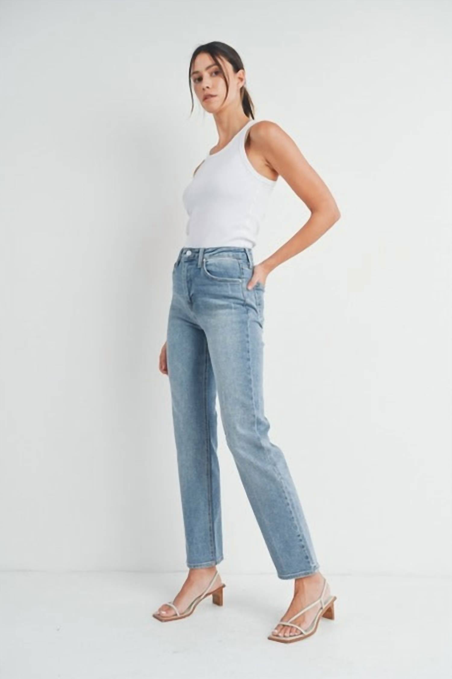 Pair these straight leg jeans with flats, sandals or even heels! You can't go wrong. Introducing the Full Length Everything Straight Jeans by JUST BLACK DENIM, perfect for those who favor style and comfort in a light wash. These women's jeans feature a high rise and straight leg design, measuring an 11" rise with a 31" inseam and a 4.5" leg opening. Crafted from 96% Cotton, 3% Elasterell-P, and 1% Spandex, they ensure a regular fit with a button closure for added convenience. Proudly made in the United States, these jeans are machine washable and can be tumble dried, ideal for a preppy summer vacation look.