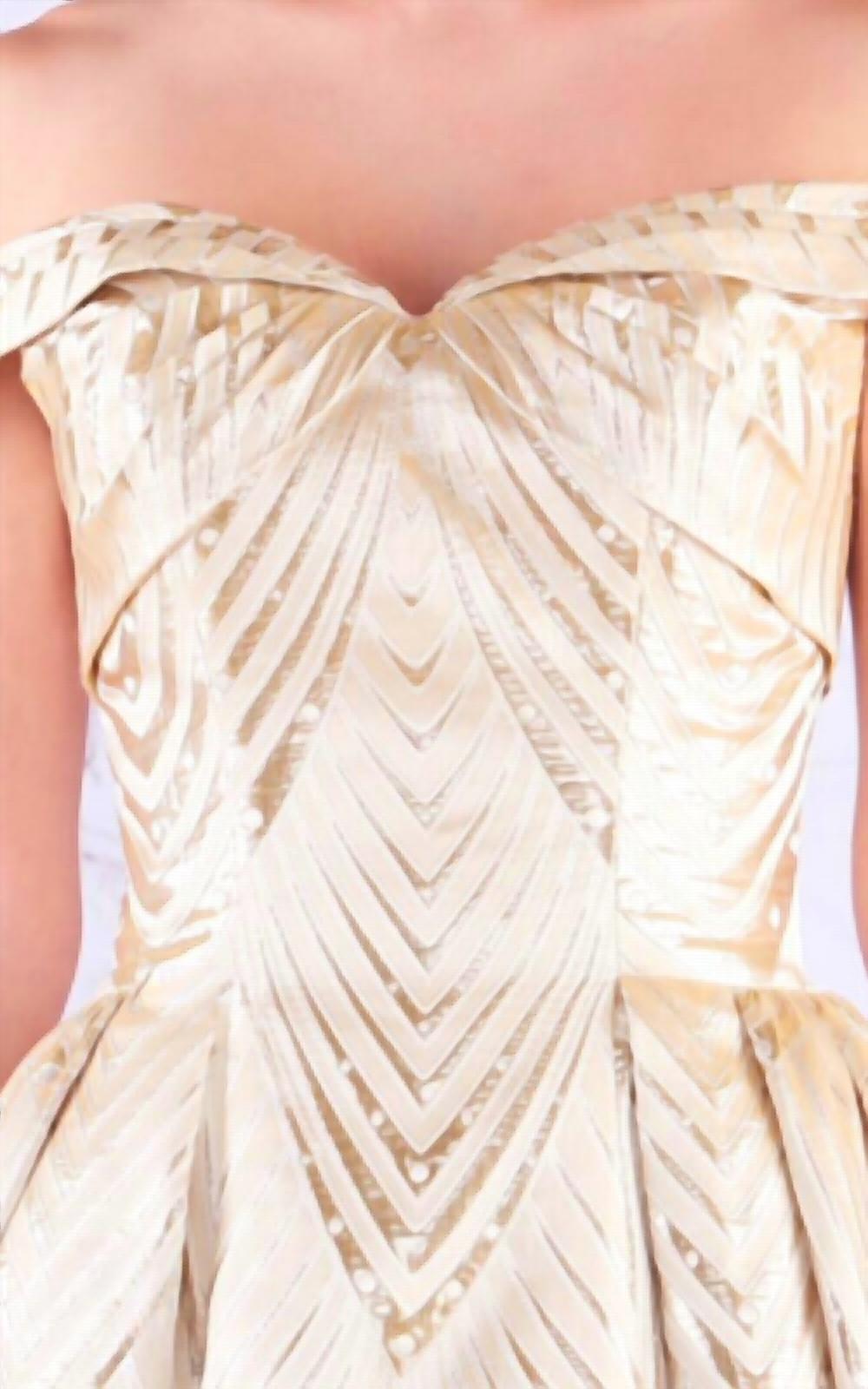 Mac Duggal off the shoulder satin ballgown with patterned fabric. Spot clean only