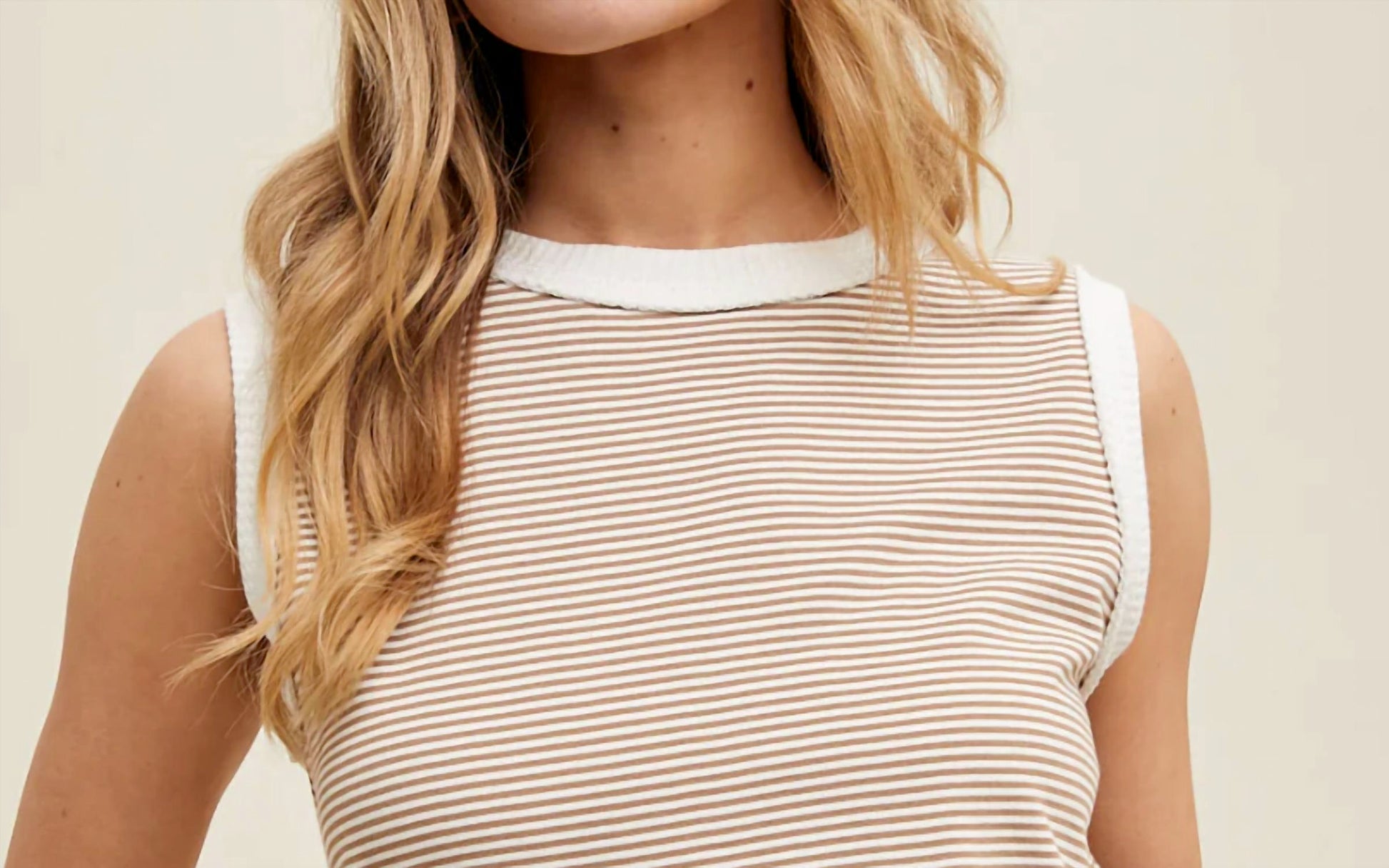 This classic tank top is perfect for layering and cute enough to wear on its own. Highlight your holiday style with the Contrast Striped Muscle Tank Top by WISHLIST in Mocha/White. This sleeveless tank is crafted from a breathable cotton blend, combining 95% cotton with 5% spandex, alongside contrast detailing in 70% polyester, 20% rayon, and 10% spandex. It features a crewneck and a pull-on closure, perfect for layering or wearing solo during summer festivities. Embrace a minimalist look with this tank, ideal for adding a modern edge to your casual or party ensembles.
