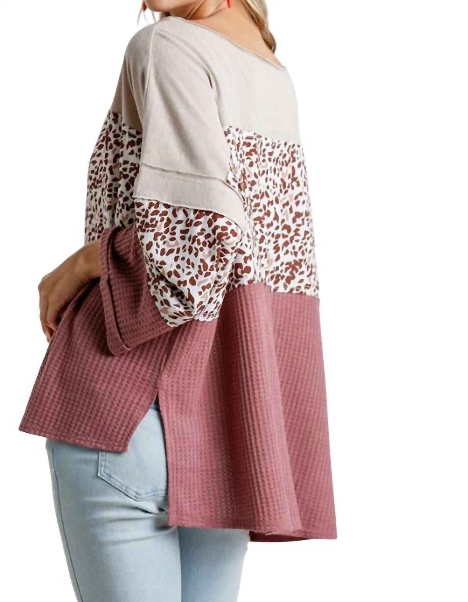 It features a wide scoop neckline, long sleeves, dropped shoulders, a high-low hemline, side slits, waffle knit fabric, raw edge detailing, and a flattering oversized A-line silhouette. Small Bust 54" Length 25". Medium Bust 56" Length 25". Large Bust 58" Length 25". XL Bust 60" Length 28". 1X Bust 62" Length 28". 2X Bust 64" Length 28". Back is longer. 64% cotton, 36% polyester. Contrast 100% polyester. Hand wash cold or dry clean. Imported.