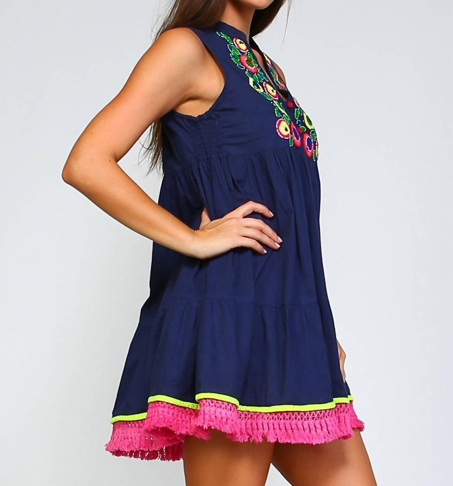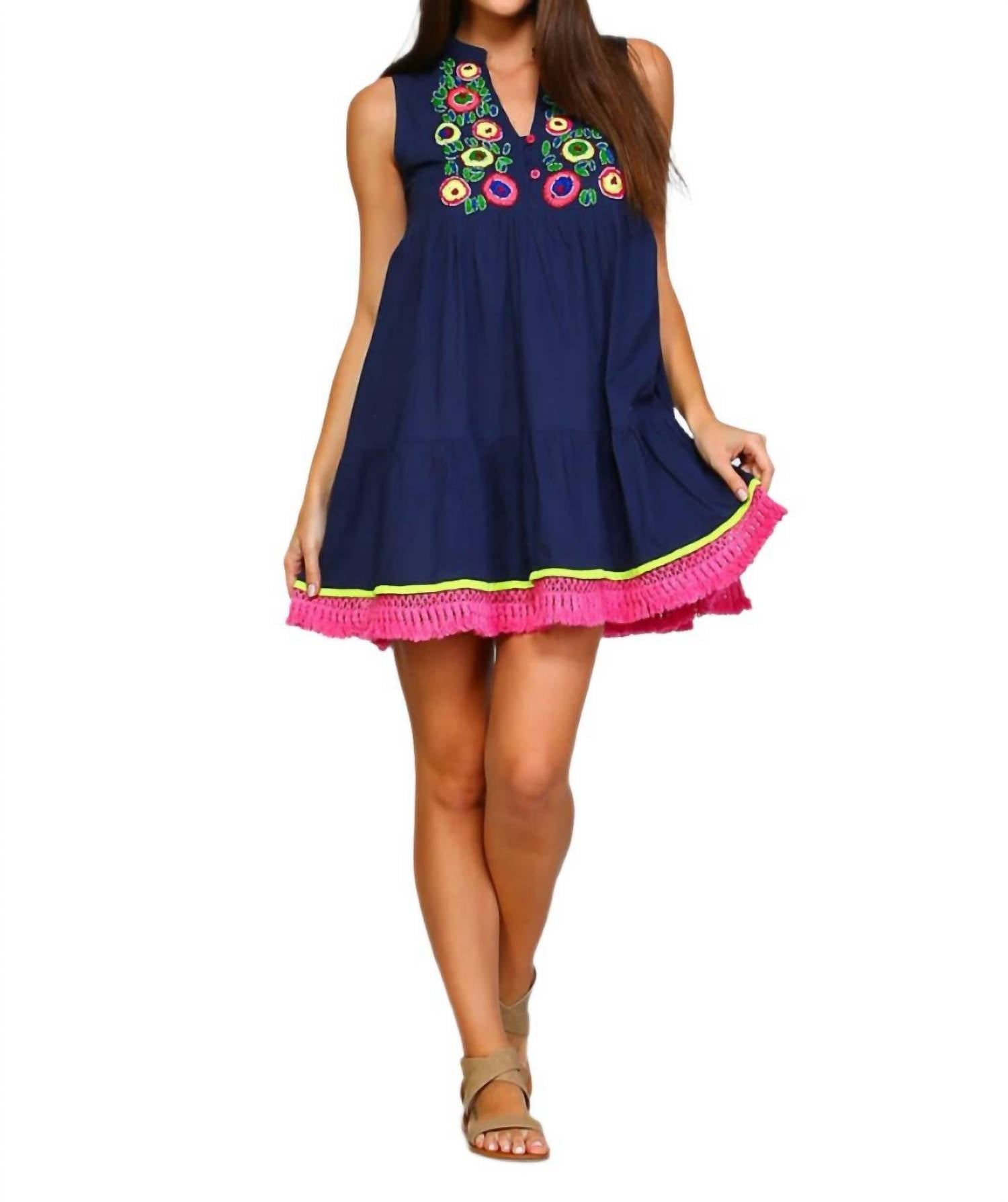 A short and breezy dress for those warmer days. Get ready to dazzle in the Beaded & Fringe Bohemian Mini Dress by Velzera, designed for those who love to make a statement. This blue, sleeveless dress features a playful V-neckline with a two-button closure and boasts colorful embroidery with beading. Its A-line silhouette is enhanced with a contrast fringe around the hem, offering both style and movement. Imported and designed for optimal comfort, it is available in XL, 2X, and 3X sizes with bust measurements of 42", 44", and 46" respectively. Easy to care for, simply hand wash this standout piece to maintain its vibrant charm.