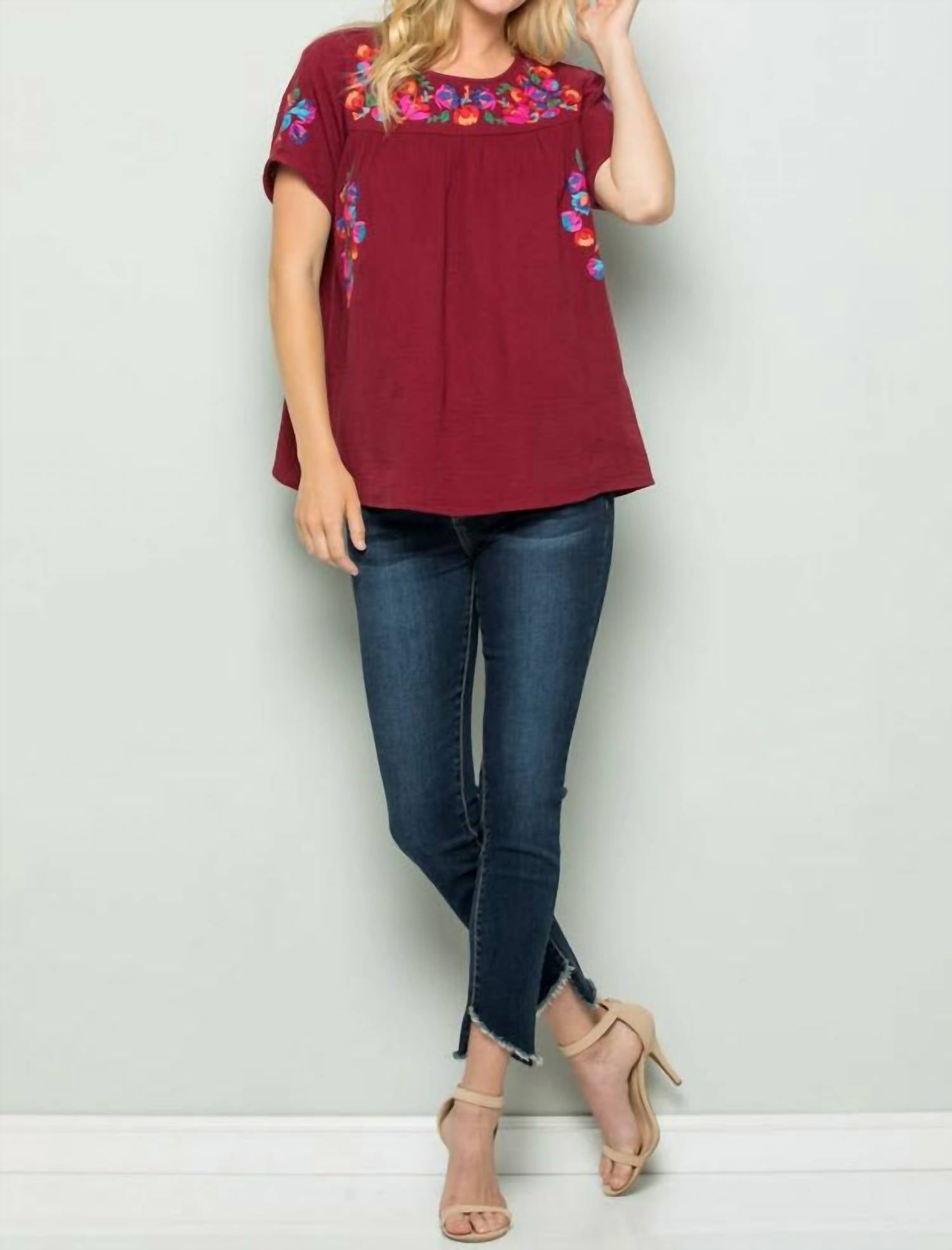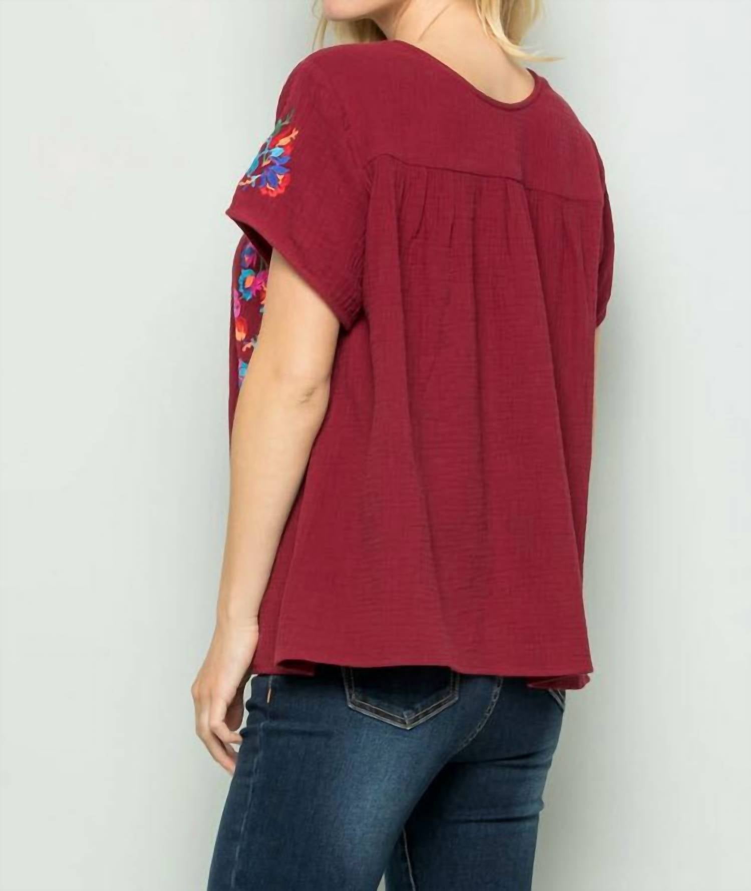 A versatile blouse that works from desk to dinner! Introducing the On The Border Embroidered Top by SEE AND BE SEEN, a boho chic blouse perfect for summer getaways or Thanksgiving gatherings. This burgundy top is crafted from 100% lightweight cotton gauze, featuring short sleeves and a crewneck, adorned with vibrant embroidery for a standout look. The flowy fit offers comfort with various sizes including Small (Bust 42", Length 25.5") through 3X (Bust 54", Length 28"). It's a pull-on style and requires hand washing for care, making it a delightful addition to any wardrobe.
