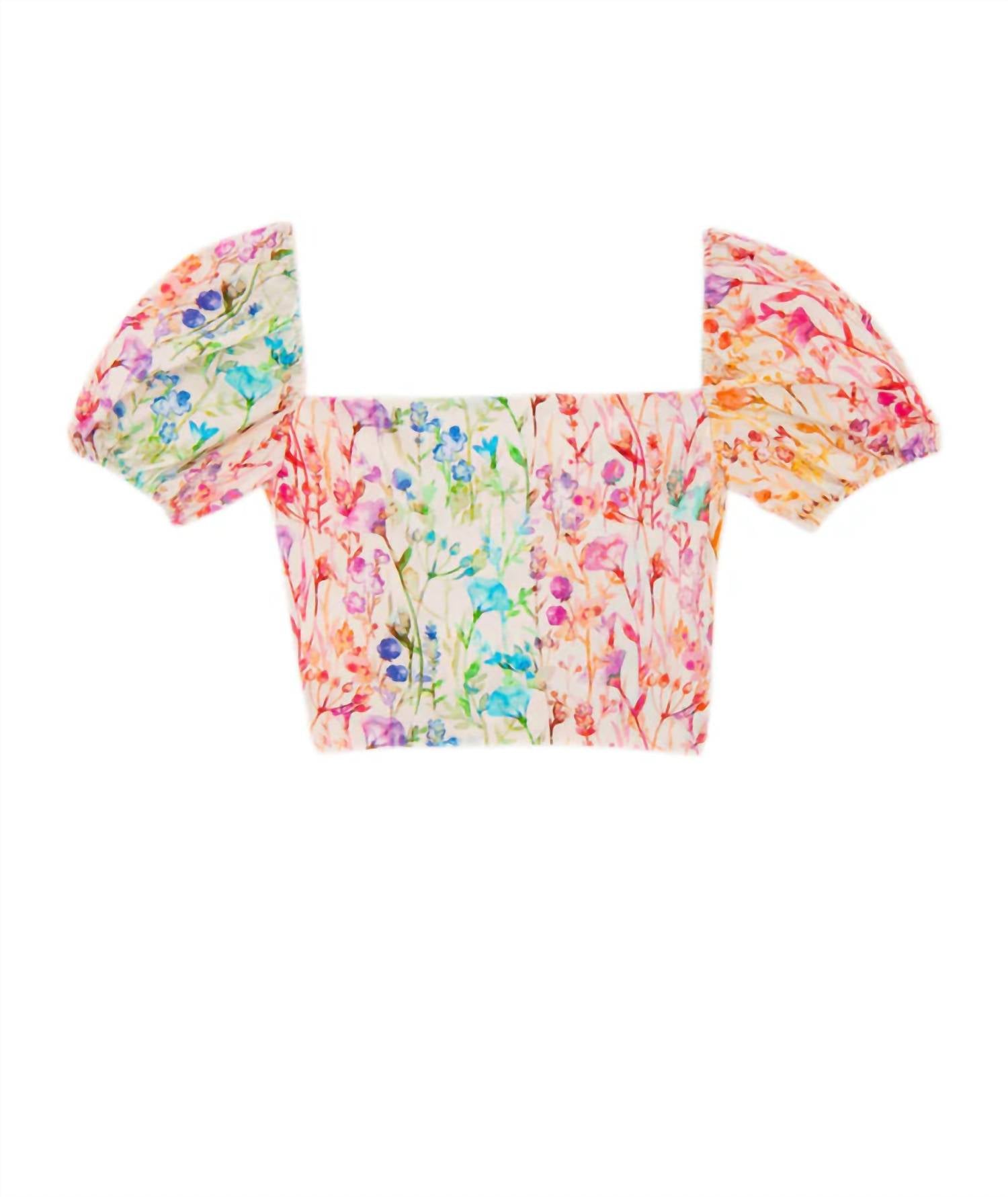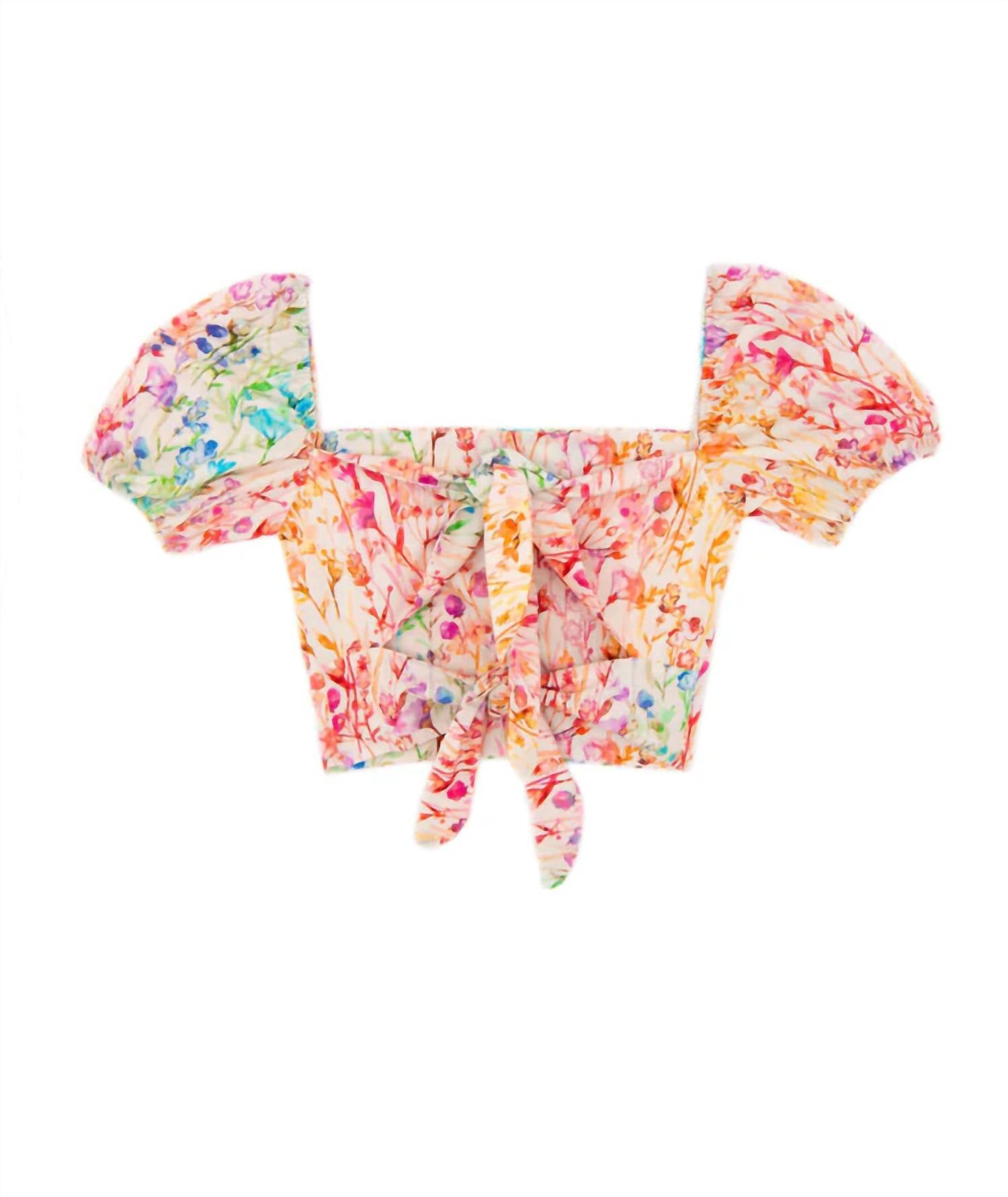 Introducing the Girl's Noa Double Tie Top by THEME, a versatile piece that promises comfort and style. This short-sleeve top features a playful puff sleeve design and is crafted from 100% lightweight cotton, ideal for all-day wear. The cropped fit with double tie options allows for customizable styling, whether tied at the front or back. Its charming Rainbow Watercolor Floral pattern adds a vibrant touch, perfect for pairing with the matching mini skirt or her favorite jeans.