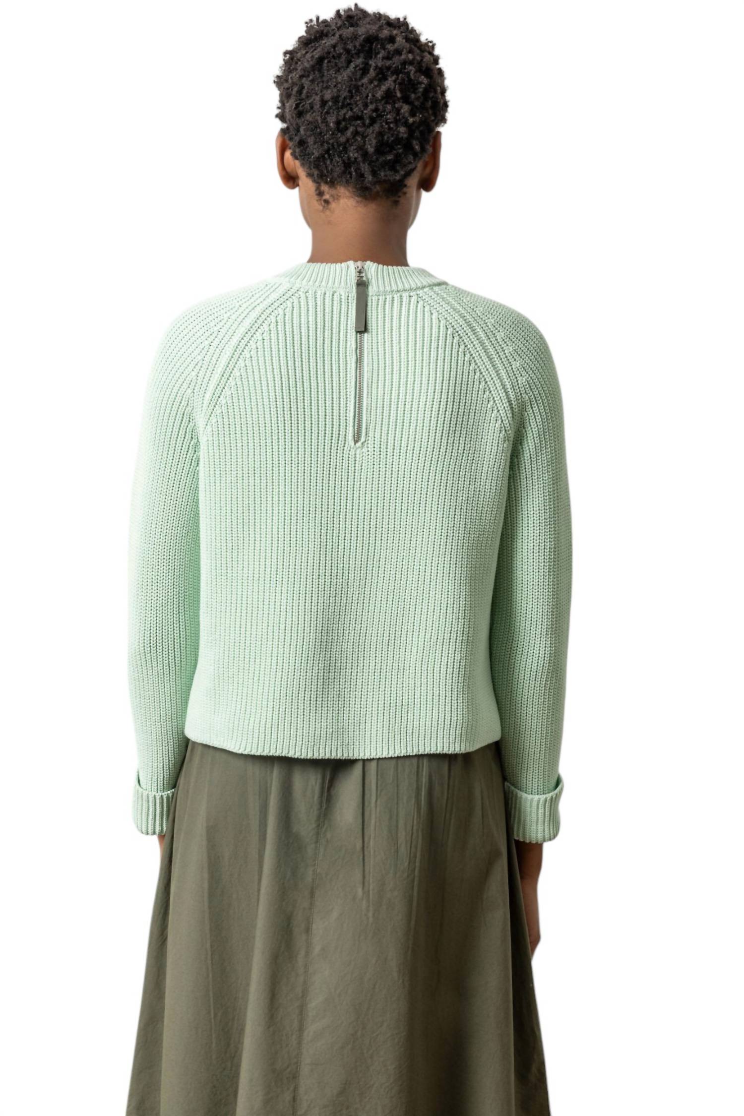 This long sleeve, crewneck sweater is crafted from a 58% cotton and 42% polyester blend, ensuring a comfortable fit. Designed with a 20" length that skims the body, it's perfect for pairing with high-waisted skirts or pants. Made with a unique back zip closure featuring a contrasting twill tape, it's an ideal choice for chic fall layering. Machine wash cold for easy care.