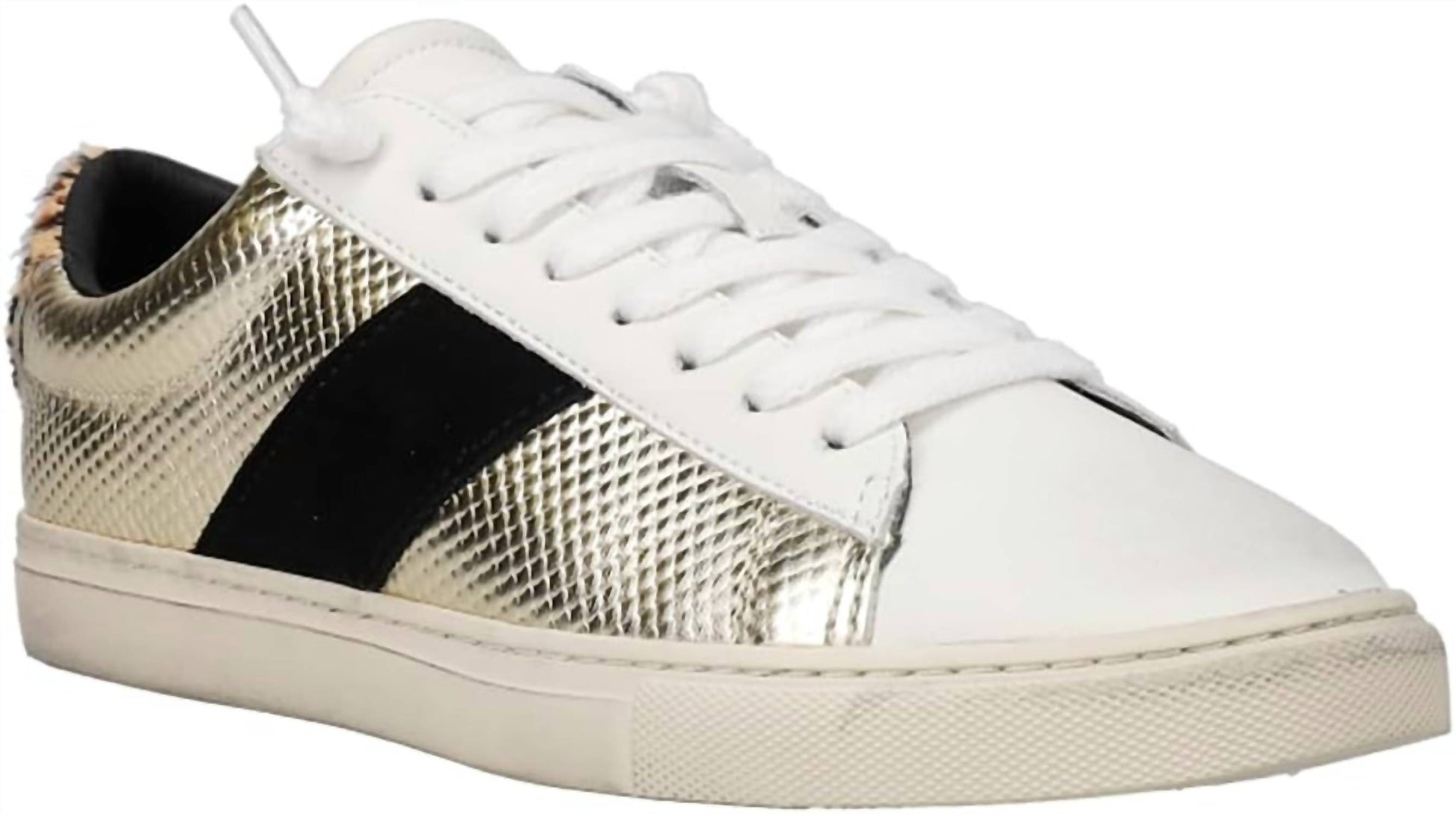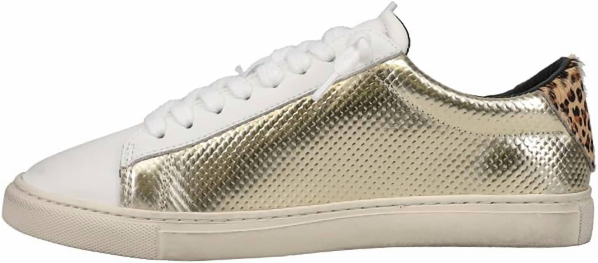 Comfortable sneakers. Style in the most casual. Gold washed metallic. Black stripe. Leopard accent on back. 100% Leather.