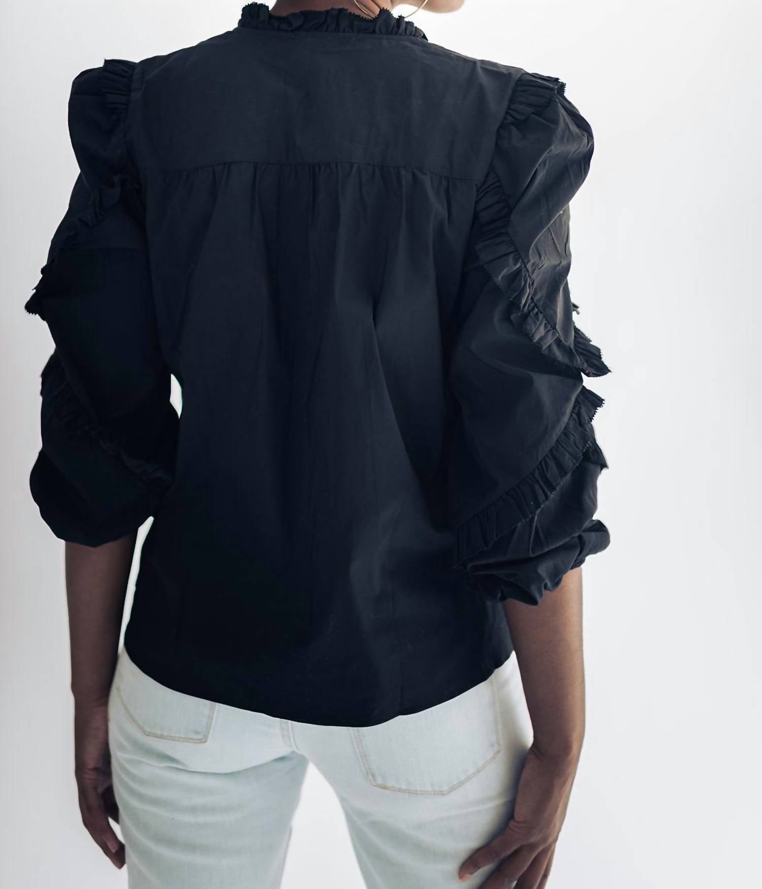 Introducing the Ruby Peasant Top by Falcon Park, a perfect blend of comfort and chic style. This black top features three-quarter sleeves with a charming arm ruffle detail, crafted from a cotton blend composition of 69% cotton, 24% nylon, and 4% spandex. The garment offers a versatile V-neckline with an optional tie neck closure and measures 23" from shoulder to hem for a medium size. Designed in a solid pattern, this pull-on top is an effortlessly stylish piece for any wardrobe.