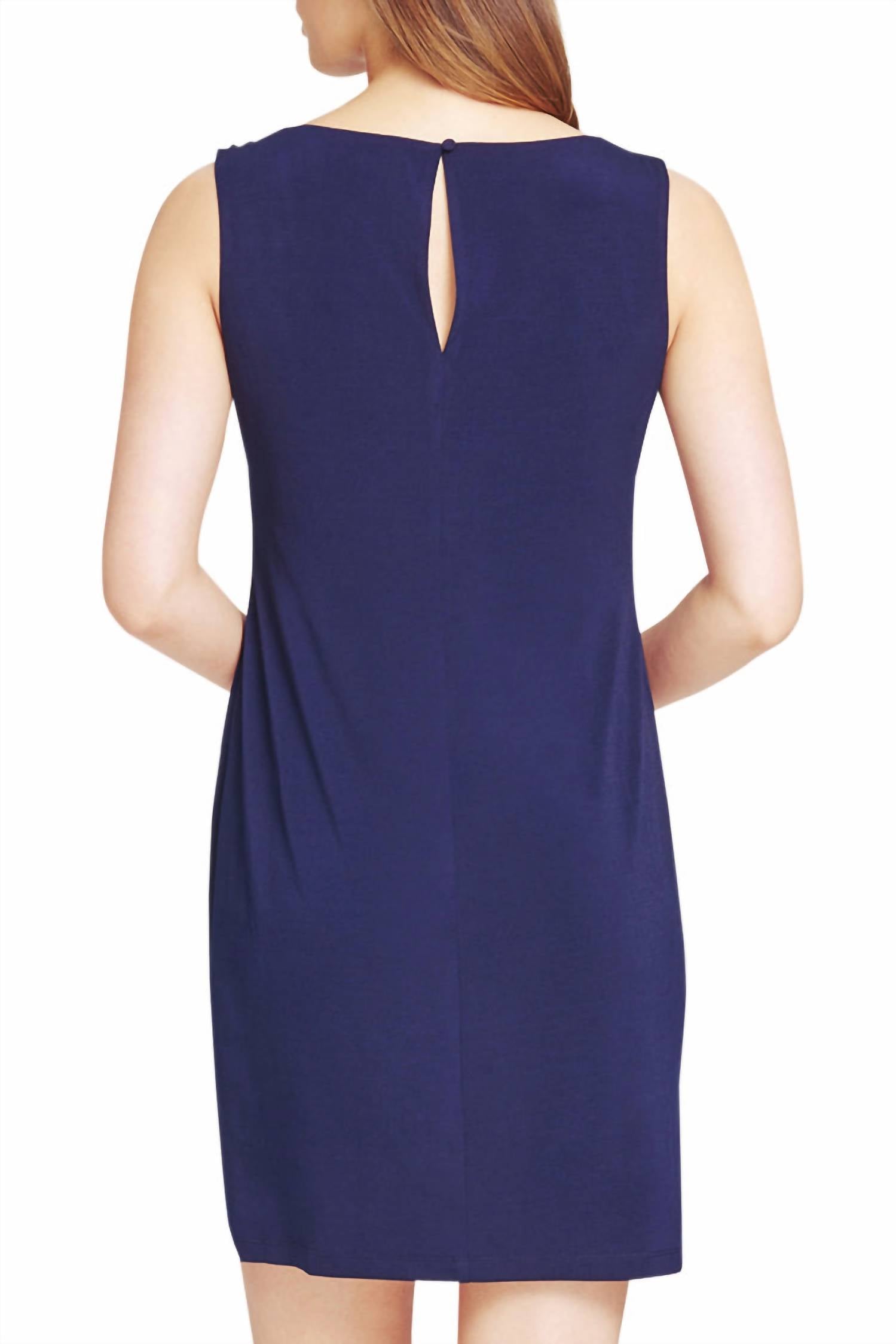 This stunning sleeveless dress features chic hardware on the shoulders and a stylish keyhole back, offering both elegance and ease. Crafted from 95% polyester and 5% spandex, with a 100% polyester lining, it ensures a comfortable fit. Length: 34.25 inches from center back for size 4. Closure: Button at the back. Silhouette: Shift.